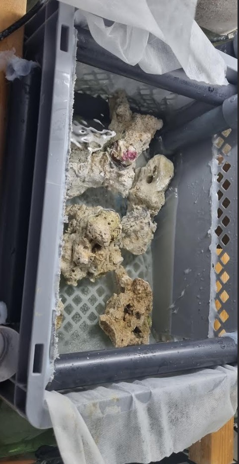Spontant tænkte jeg at bygge en fragghylle 10 cm over bunden i sumpen (skummeren skal jeg beholde), en/et par kraftige returpumper for at forhindre ditrius, og så smide på en masse tør levende sten, jeg har ca. 50 kg som ligger i haven, som jeg kan rense og da de ikke kommer få lys, så forventer jeg at de ikke bliver overgroet med kalkalger og dermed slutter fungerer (old tank sundrom). Samtidig tænker jeg at samle på en masse svamp som skal leve på stenene.