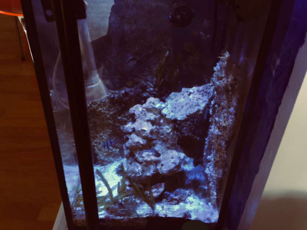 Jeg havde den lille søjle der kørte, i gennem pausen, med en hel del sten i, fik LS i fra klovnefisken og lidt fra Decocean = fra 2 forhandlere, så hentede jeg nogle meget indkørte sten ved Trine/Joel, hentede lidt meget indkørte sten v koralfarmen (noget af mine gamle) dertil en røvfuld tørre “nye” sten og nogle af mine gamle der havde ligget tørt i 4 md og derefter blev udvandet med, først lidt klorin og derefter med det der lac... et eller andet halløj der suger Po4 ud af stenene. Så, en god blanding af nyt og gammelt og fra mange systemer