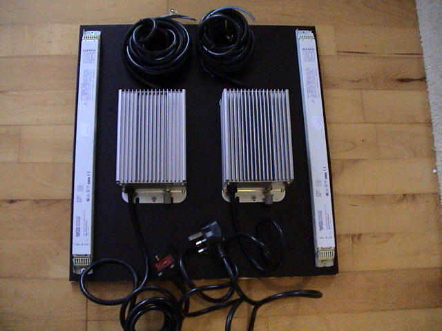 den bliver med 4 * 54 w t5 med sunrise på alle fire og 2 * 250 w E40