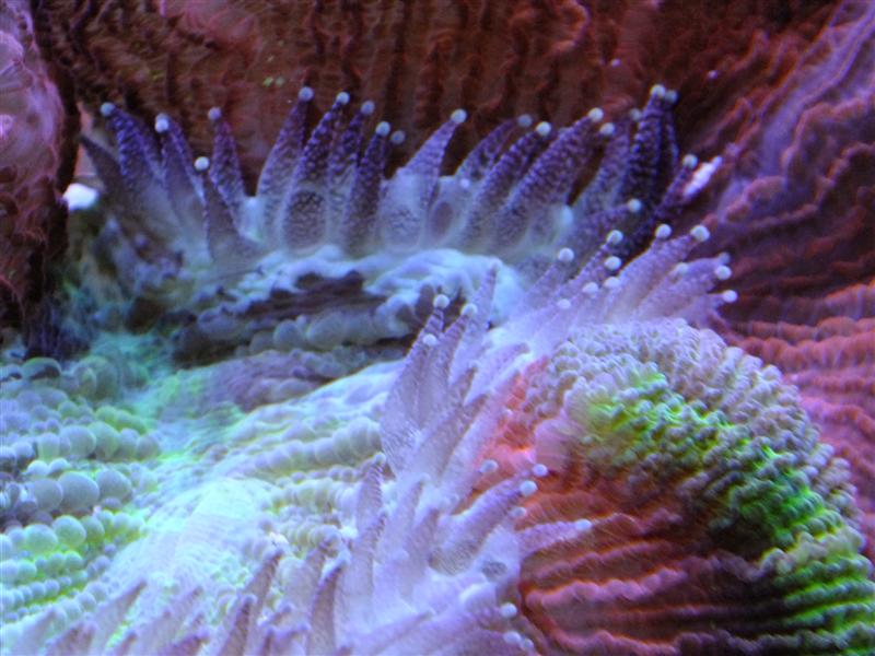 En af mine Goniopora har også tabt en del farve og 3 af dem har fået områder hvor der ikke er polypper. Omvendt ser den lyserøde alligevel ud til at trives bedre en den gjorde i starten. Polypperne er langt mere udstrakte. Den mørkerøde Goni trives næsten for godt. Den svitser bare alt hvad der er indenfor en radius på næsten 20 cm :( .