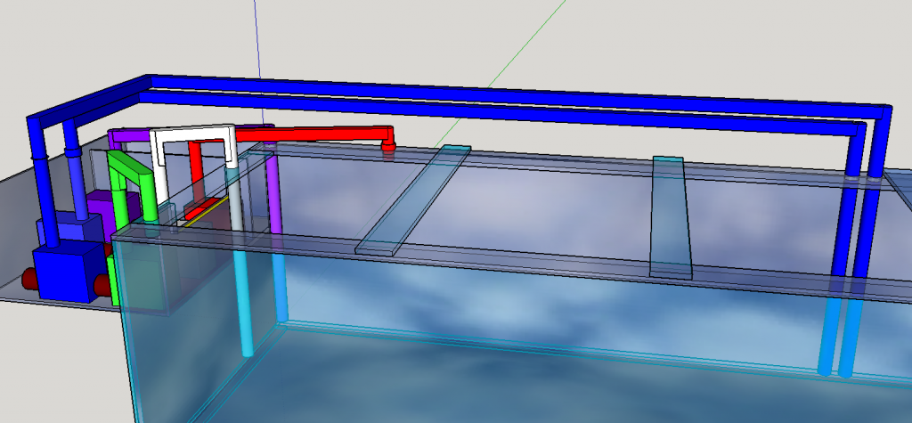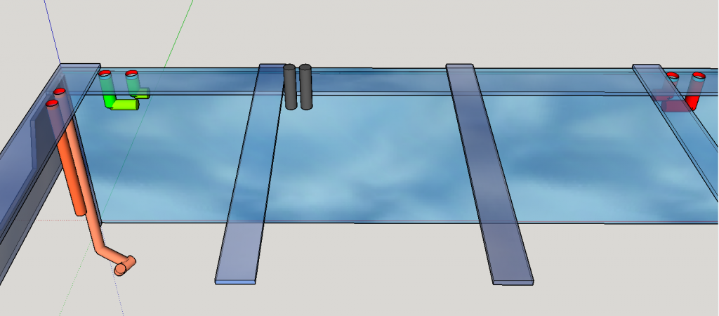 1) De 2 sorte rør lidt til venstre for midten er retur fra sumpen, de er placeret så der er 15 CM til bagglasset for at pumperne kan få nok vand i rørelse, det er vel nok til ikke at forstyrre flow, eller skal der mere plads til?