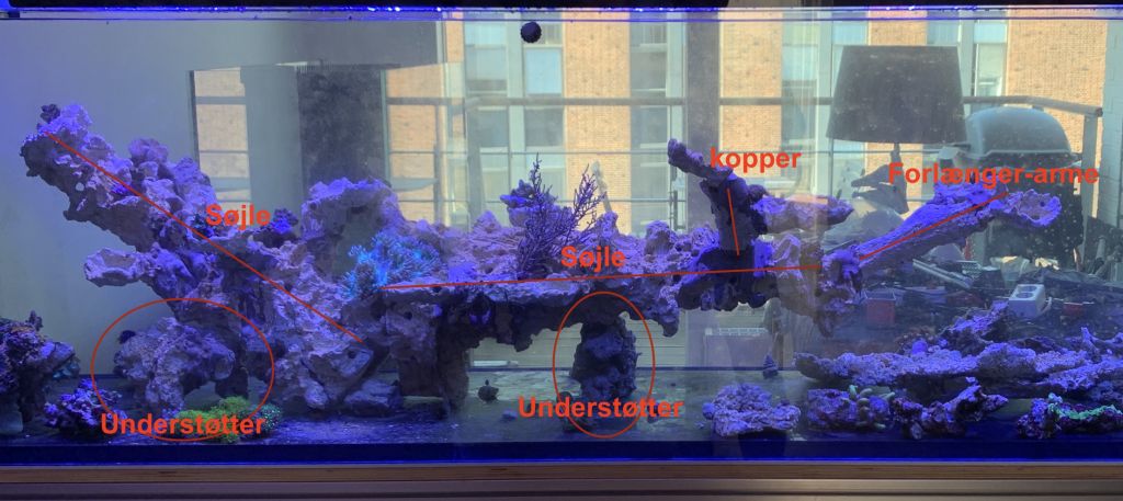 Der er brugt 1 stk. Aquaroche Reef Pillar - 0868 og 1stk Aquaroche Reef Pillar - 0858. sat sammen, lagt ned på vandret i V form cr. 30º og 5º til det store overhæng så har jeg boret en masse Ø 10mm huller frags, forlænger arme Aquaroche Acroporock Branch - 9774 og Aquaroche. Acroporock Batch of 6 cups.