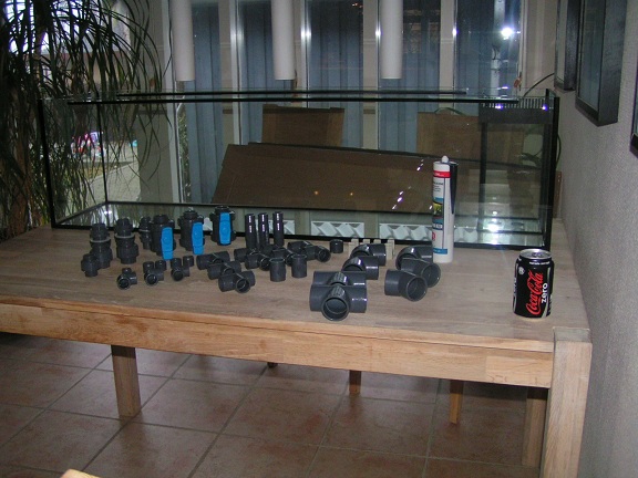 Men har fået lavet huller til gennemføringer og monteret gennemføringerne i akvariet så nu kan jeg begynde at lime pvc.