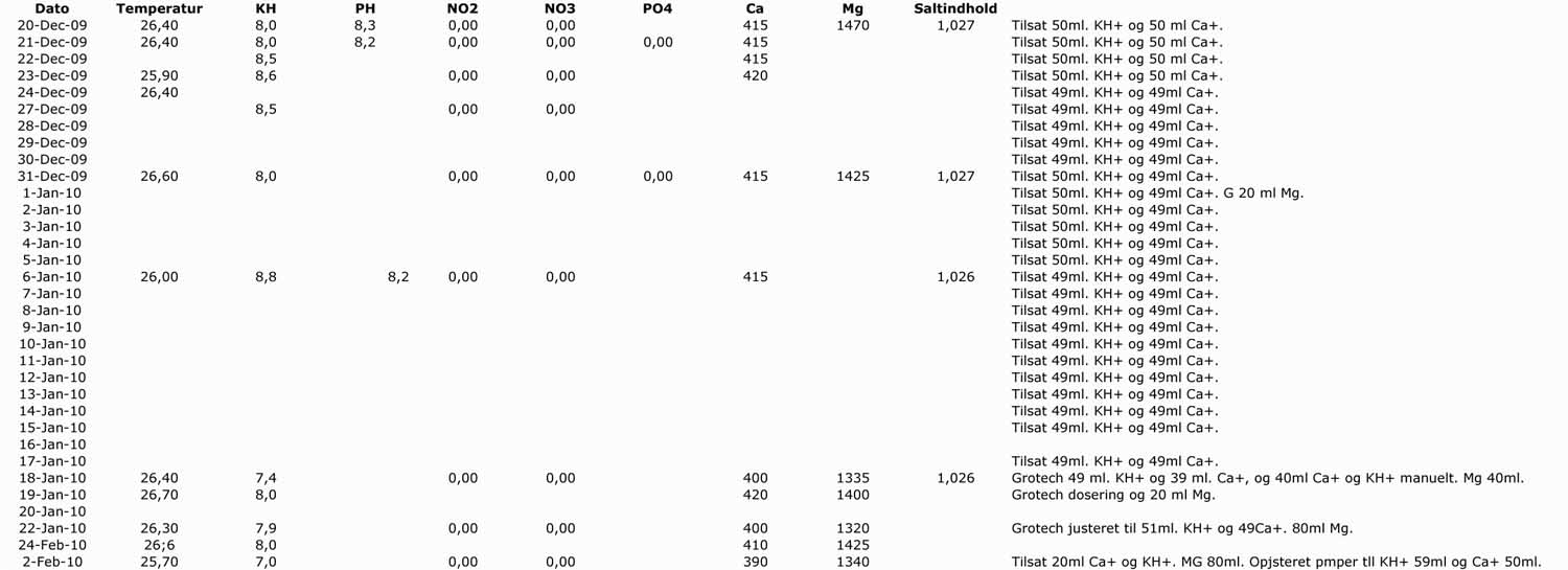 Tak for de venlige kommentarer. I øjeblikket er jeg lidt på vandtestafvænning. Jeg doserer dagligt med Ca og KH. og vil så teste vandet i weekenden. jeg er lidt spændt, men jeg tror værdierne ligger nogenlunde hvor de skal. Det ser i hvert fald ud til baljens beboere har det rigtig godt. Skal i løbet af foråret have lavet en vatfilterløsning i mit overløb. ellers virker mit setup rigtig fint.