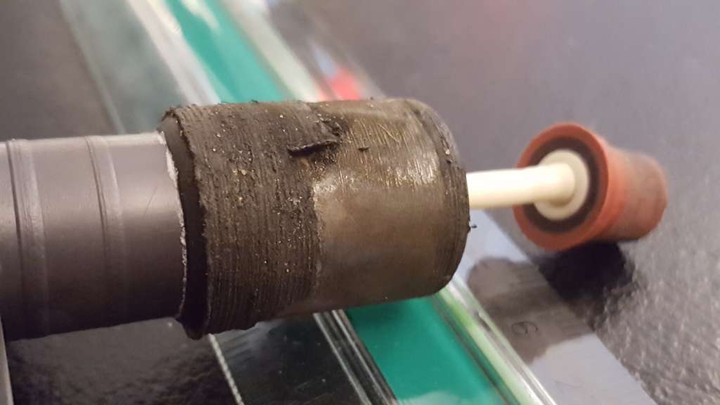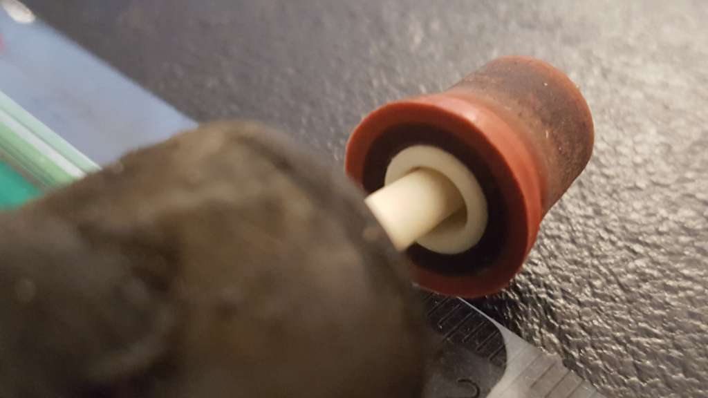 Vi bygger det på det som de næste billeder viser. Akslen er en keramisk aksel og de er meget hårde. De kan klare temmelig meget. Men akslen var tydeligt deformeret. Skal man nu være bekymret, hvis man kører med kalkreaktor? Det tror jeg ikke.