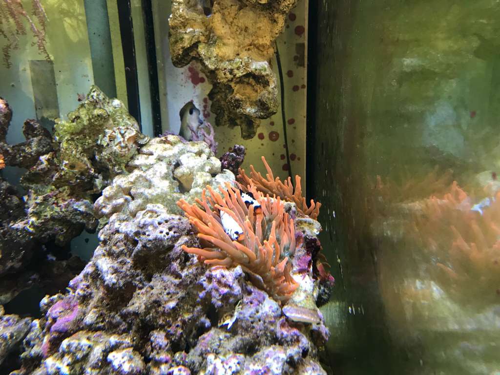 Så kom der klovne og en extra anemone i, jeg har købt en "mixrock" af Lars og der var klovne og deres anemone og i den boede også to krabber og på sten sad også skiver og zoa's der var også orme(de gode) små muslinger og en enkelt moneta cowrie, anemonen var super stor og pæn i farven men da jeg jo har en muræne der spiser muslinger rejer blæksprutte og krabber (frost) som jeg fodre næste hver dag fandt klovne hun ud af at hun kunne stjæle mad og give til sin anemone og så gøre klar til æg ved at sætte hannen i gang med at gøre rent under anemonen og hun selv gik i gang med at fange de to krabber i et ben og løfte dem over i den anden side af akvariet og for at gøre det helt super så deler anemonen sig efter alt den mad.