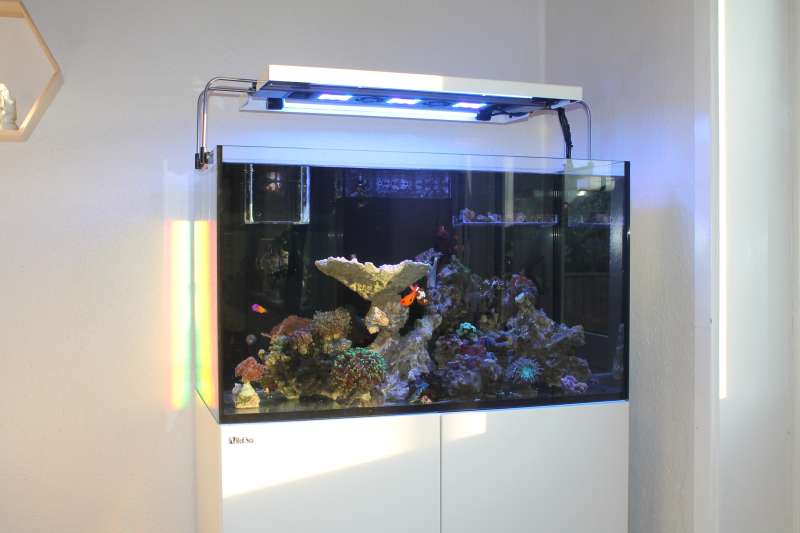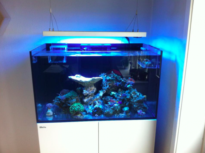 Det går langsomt fremad. Pumperne er sat på bagsiden selvom det ikke nok ikke giver de mest optimale betingelser for bevægelse af vandet. Dog slipper jeg for at se på motordelen og ledningen, hvorfor de bliver hvor de er. Jeg skal have bestilt net-top til akvariet så fiskene ikke hopper ud og ellers skal der bare monteres reaktorer. Fik min rowa reaktor hjem i dag. Som tidligere skrevet bør jeg måske skaffe mig en Kessil mere, men da det er en dyr lampe må det vente lidt endnu. Bortset fra de manglende ting er jeg godt tilfreds so far.
