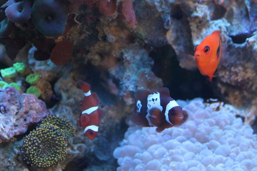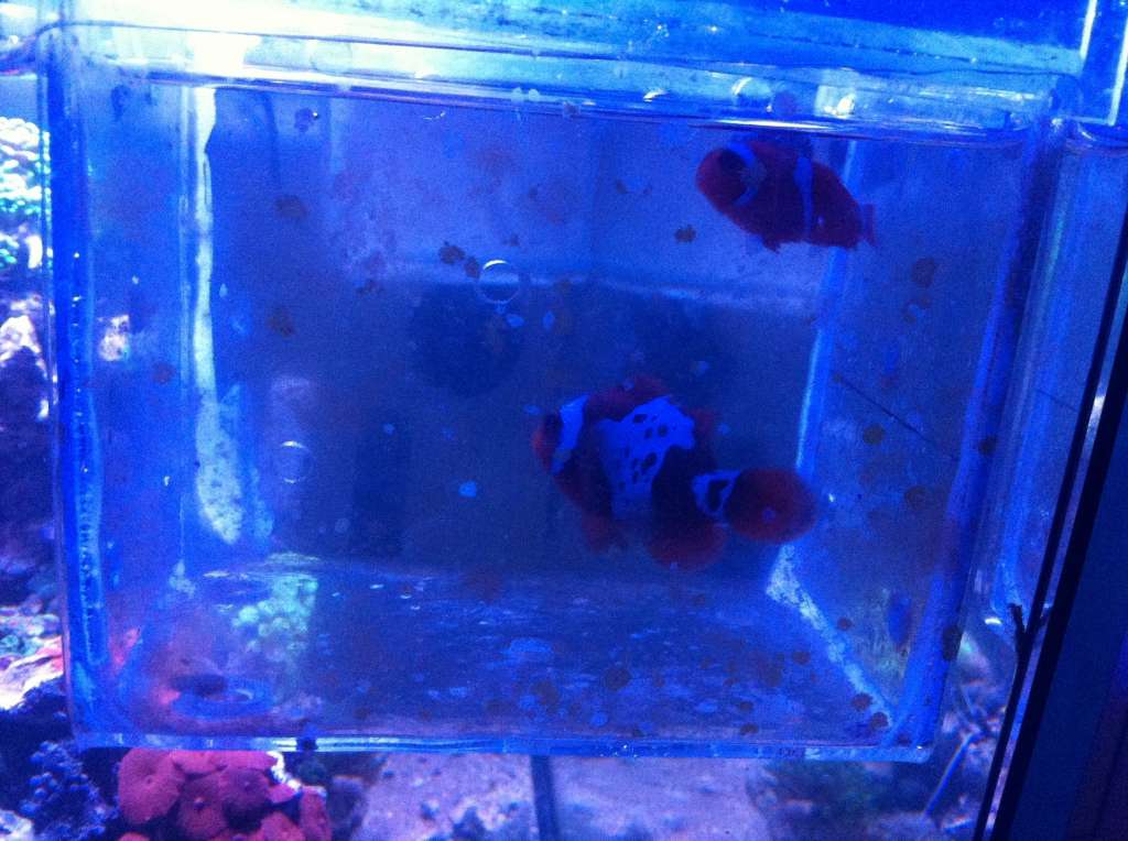 Jeg har gjort mig lidt tanker om klovnene. Da jeg sammensatte mit gamle par GSM (gold stripe maroon) havde jeg en stor hun og en lille han. De havde en anemone og da de blev lukket sammen ignorerede hunnen fuldstændig hannen. Hun var dog også markant større end min største lightning. Problemet er uden tvivl at den største af mine to fisk stadig ser den anden som en konkurent, der helst skal kastes over akvariekanten hvis muligt. Jeg prøver derfor at købe en bubbletip, som er naturlig for netop fløjlsklovnene at bo i. Så må jeg se om det kan hjælpe lidt på agressionerne.