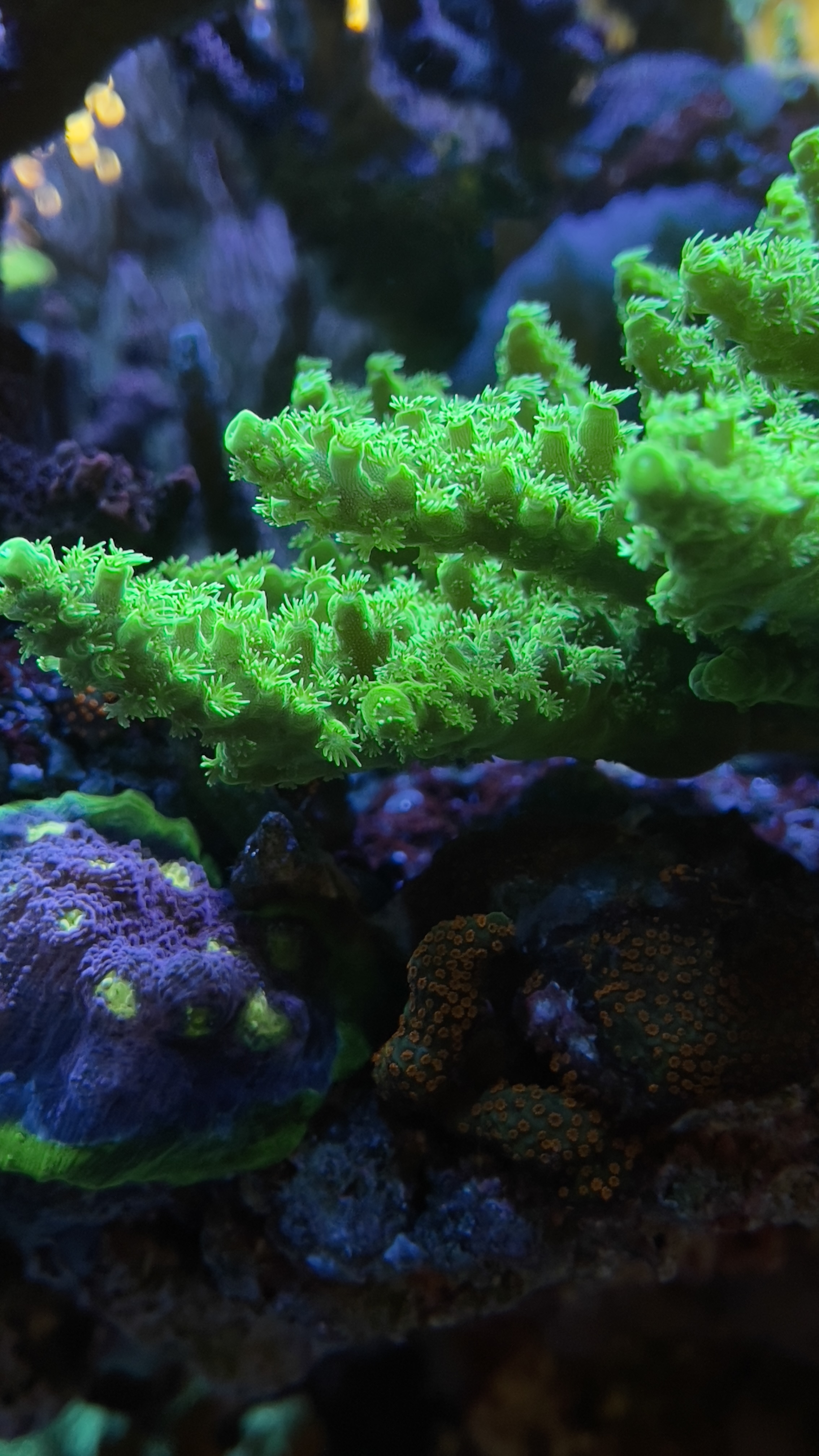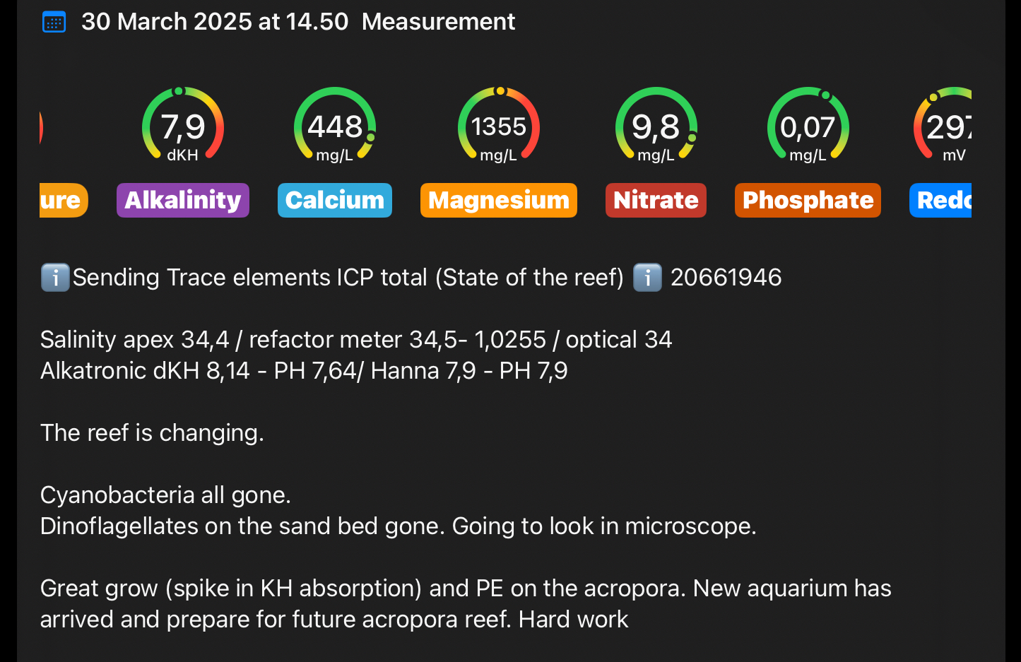 Generalt står det mega godt. Ingen dino mere, ingen cyanobakterier , flotte PE på acroporaerne, gode vækst spidser og farver er begyndt at komme igen på min WD. Hold nu fast den tåler ikke meget ubalance før den bliver mere grøn end gul 😱