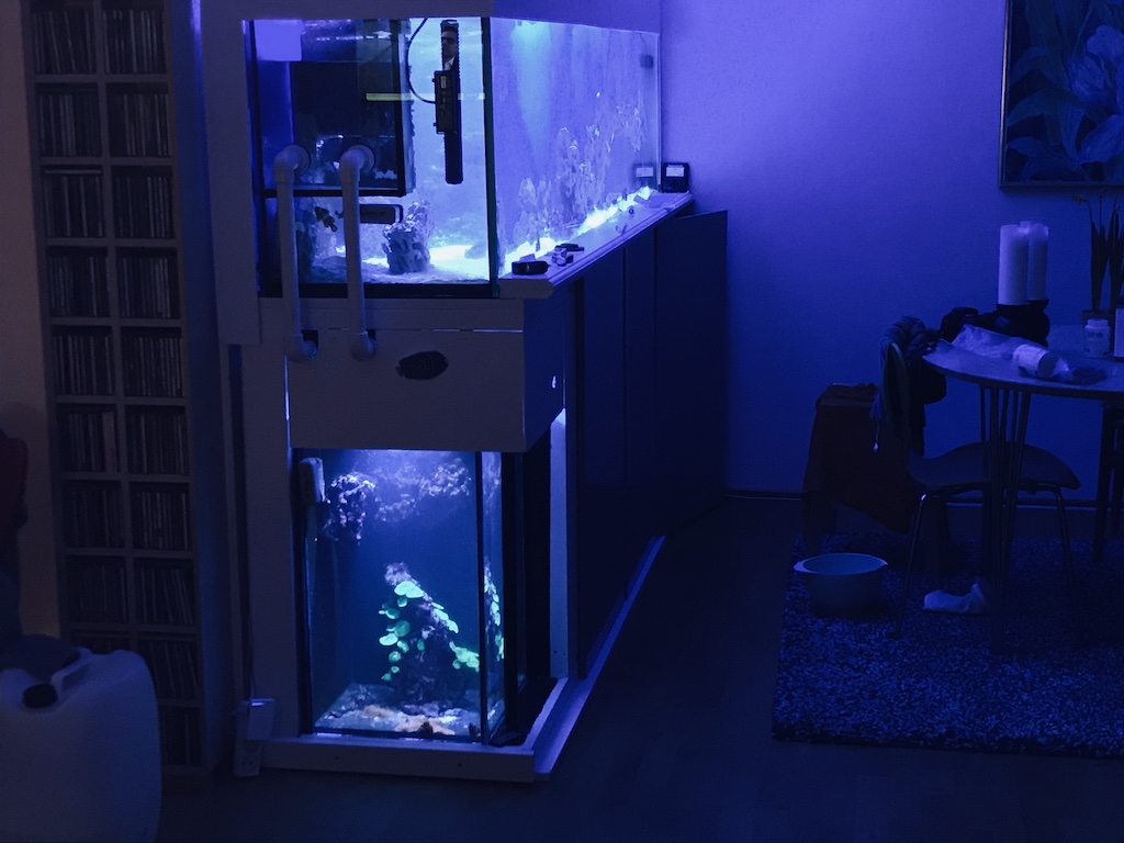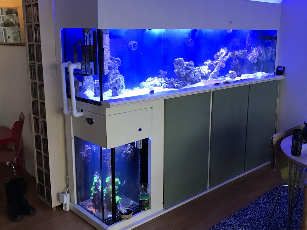 Jeg har også tilføjet endnu et (lille) akvarie til systemet, (60 L) dette huser fremover makro alger og fungerer også som pods fabrik. Udløb herfra ryger ned lige ved siden af returpumpen i hovedsump. På den måde håber jeg der kan ryge en lind strøm af pods op i DT. Jeg har boret et hul ifronten af akvariet i venstre side/bunden af dette lille akvarie og vil bruge det i forbindelse med vandskifte, ved at stoppe tilløb til det og så åbne afløbshanen, derefter fylde nyt vand i dette og slutte det til resten af systemet igen. Det kommer max til at tage 5 min, så jeg tænker en god del af de pods der sidder o makroalger og på glas nok skal overleve…?