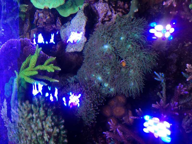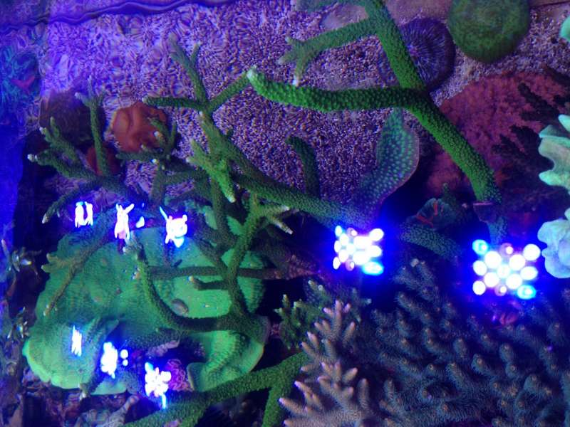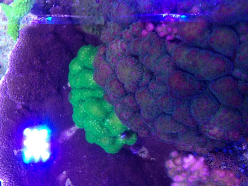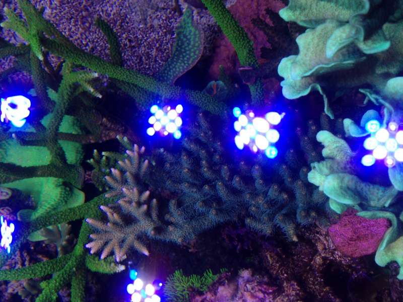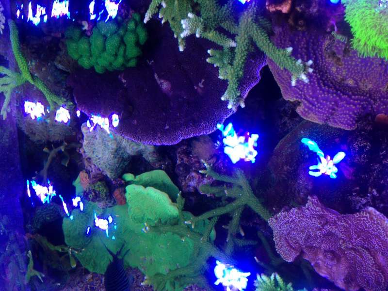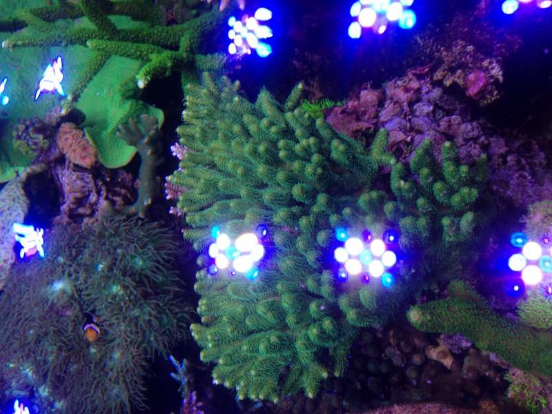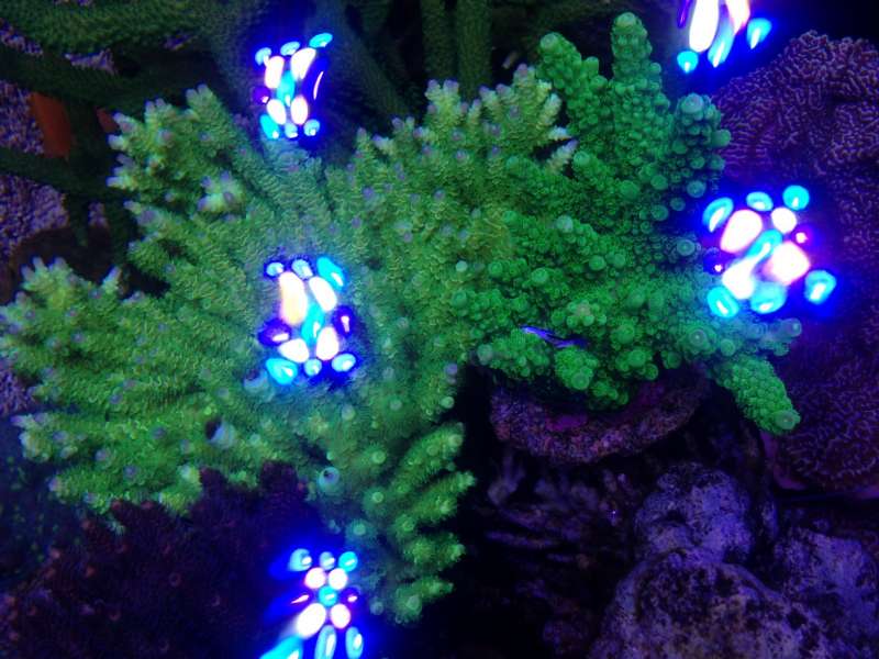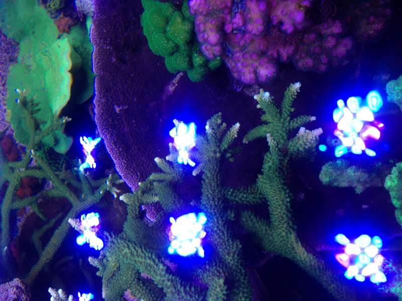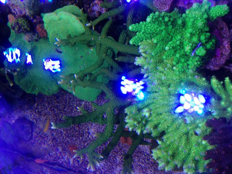 Men det var nu ikke det jeg ville kommentere. Mine Acranstrea'er (specielt de nye" har samme adfærd, når lyset slukket kommer de frem. Jeg bilder mig ind at det er normalt for korallerne at søge føde om natten, og eneste grund til at de ikke søger føde i naturen om dagen er at de skulle blive ædt. I vores systemer er der ingen rovdyr og de vender sig langsomt til at det er sikkert at søge føde 24/7.