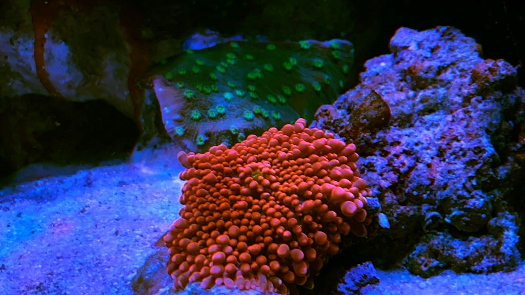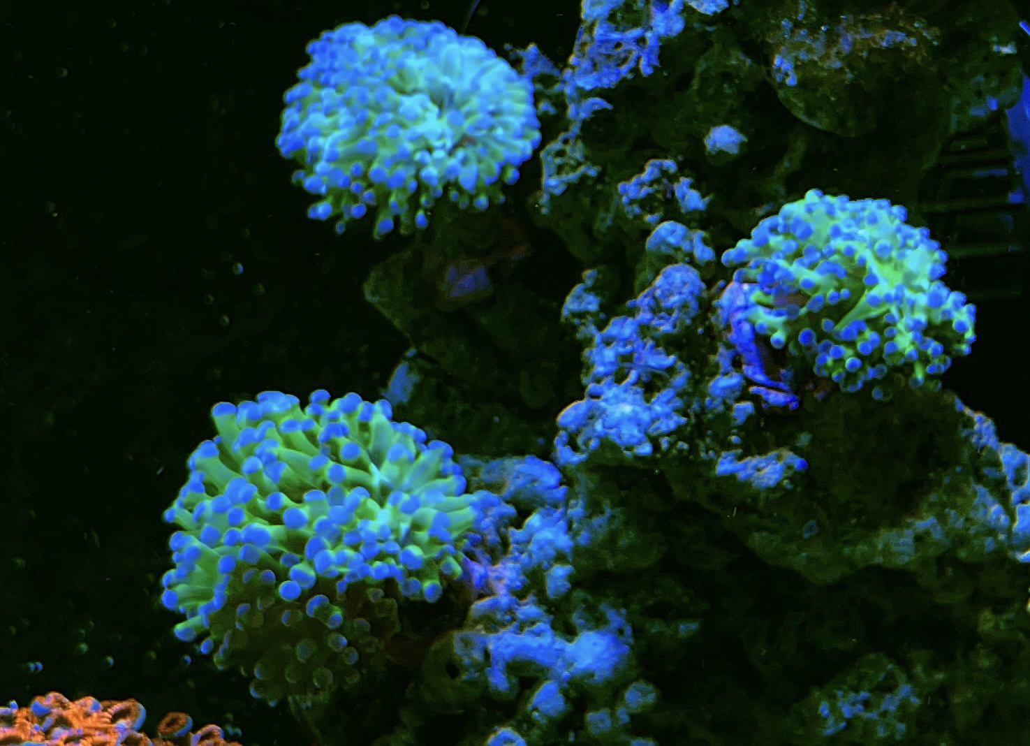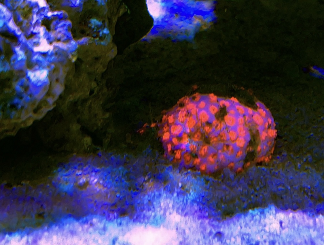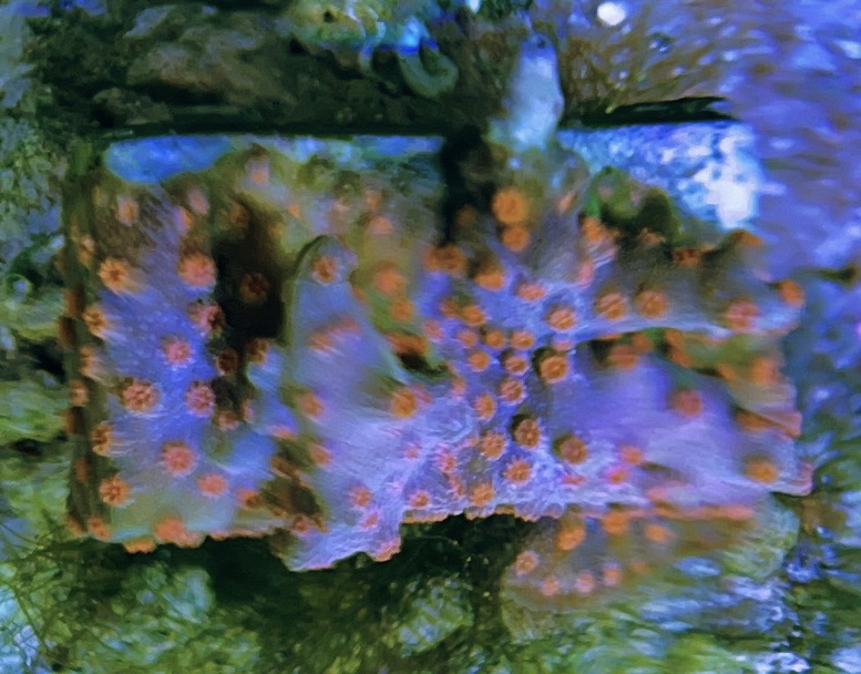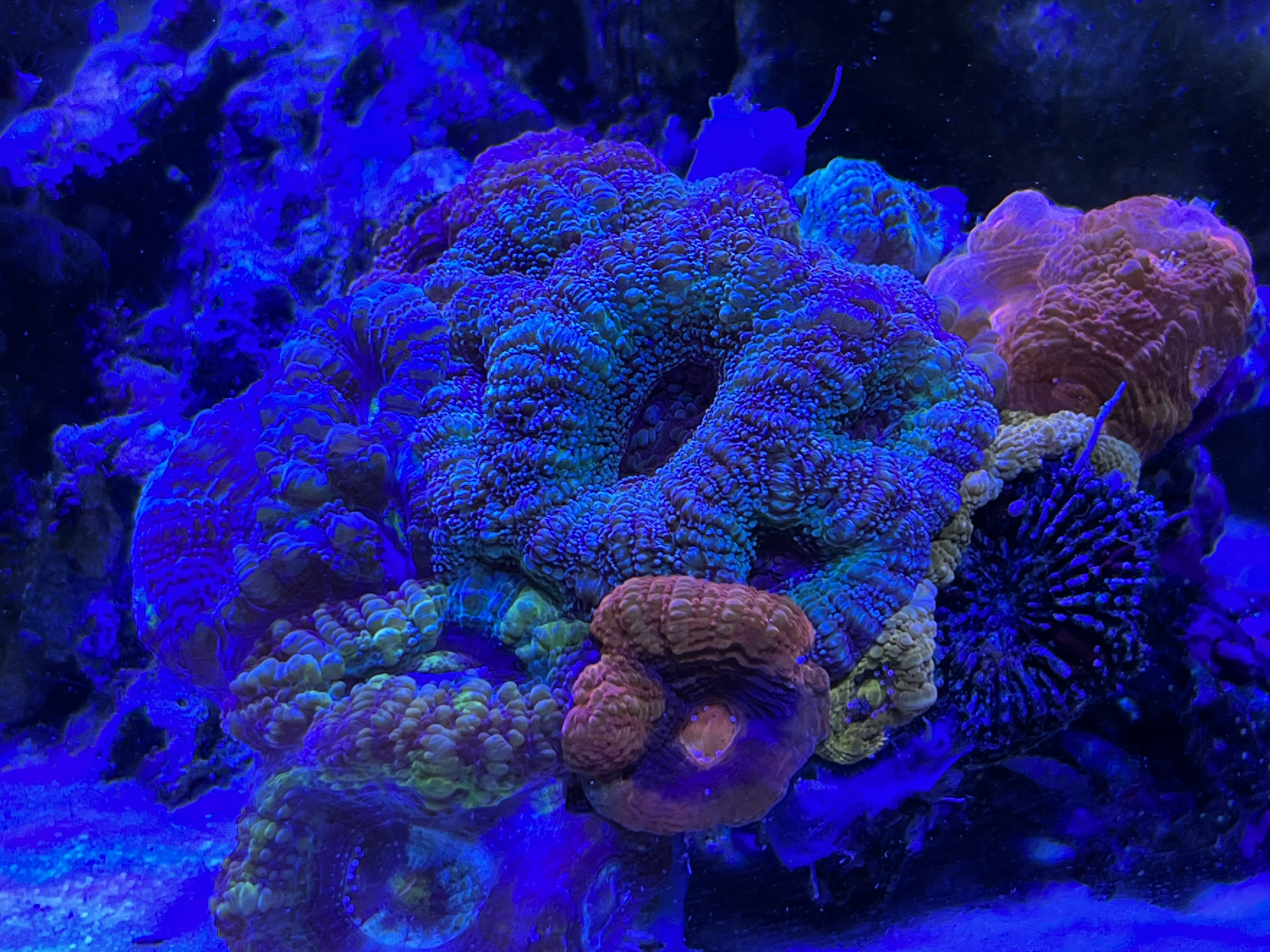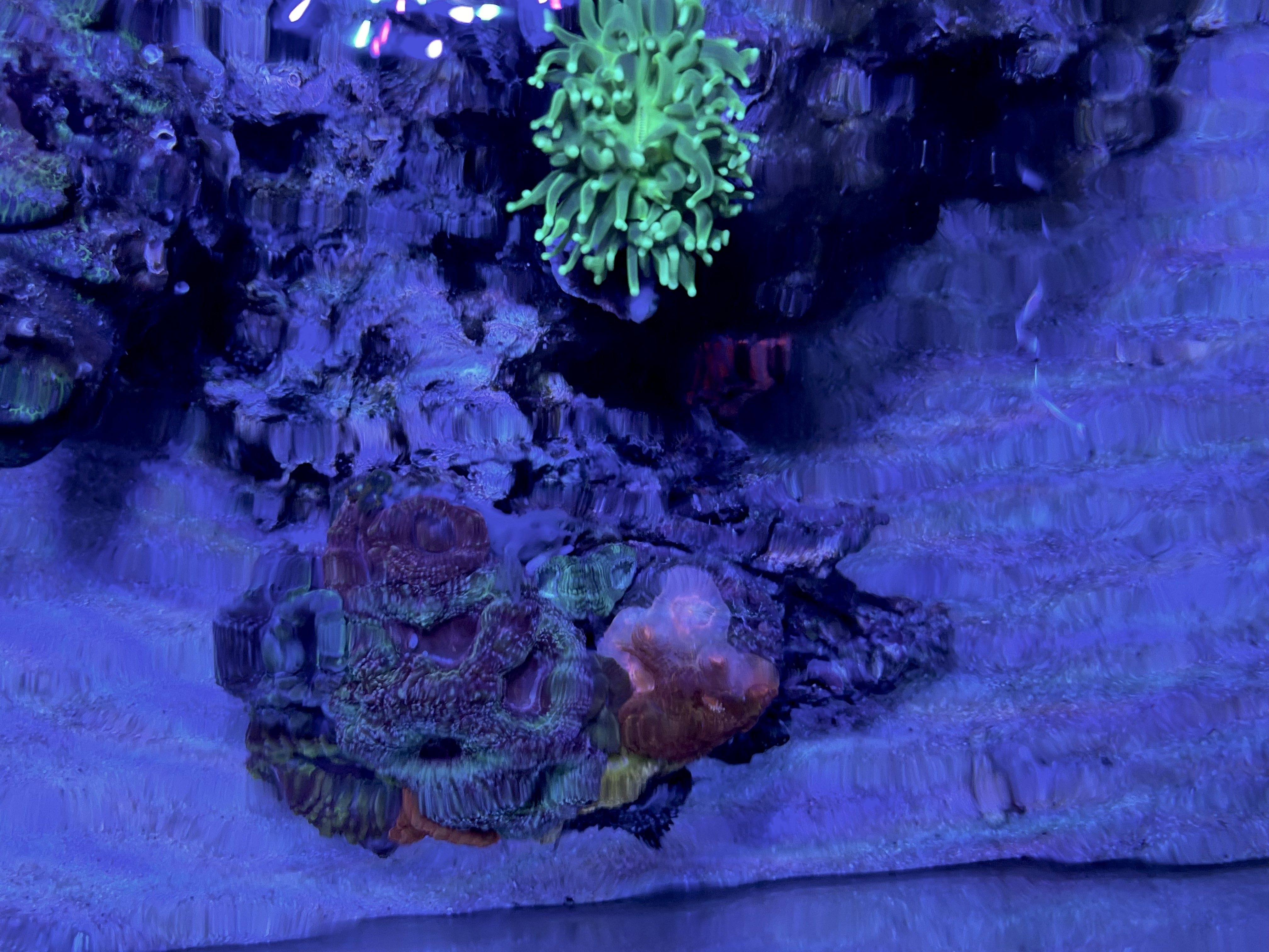 Homophyllia klumpen overvejer jeg at skille lidt ad. Den nederste gule er pænt “træt” kan man se….. Jeg giver dem lige lidt tid og hvis den ikke retter sig så må jeg igang m hammer og mejsel 👍🏼