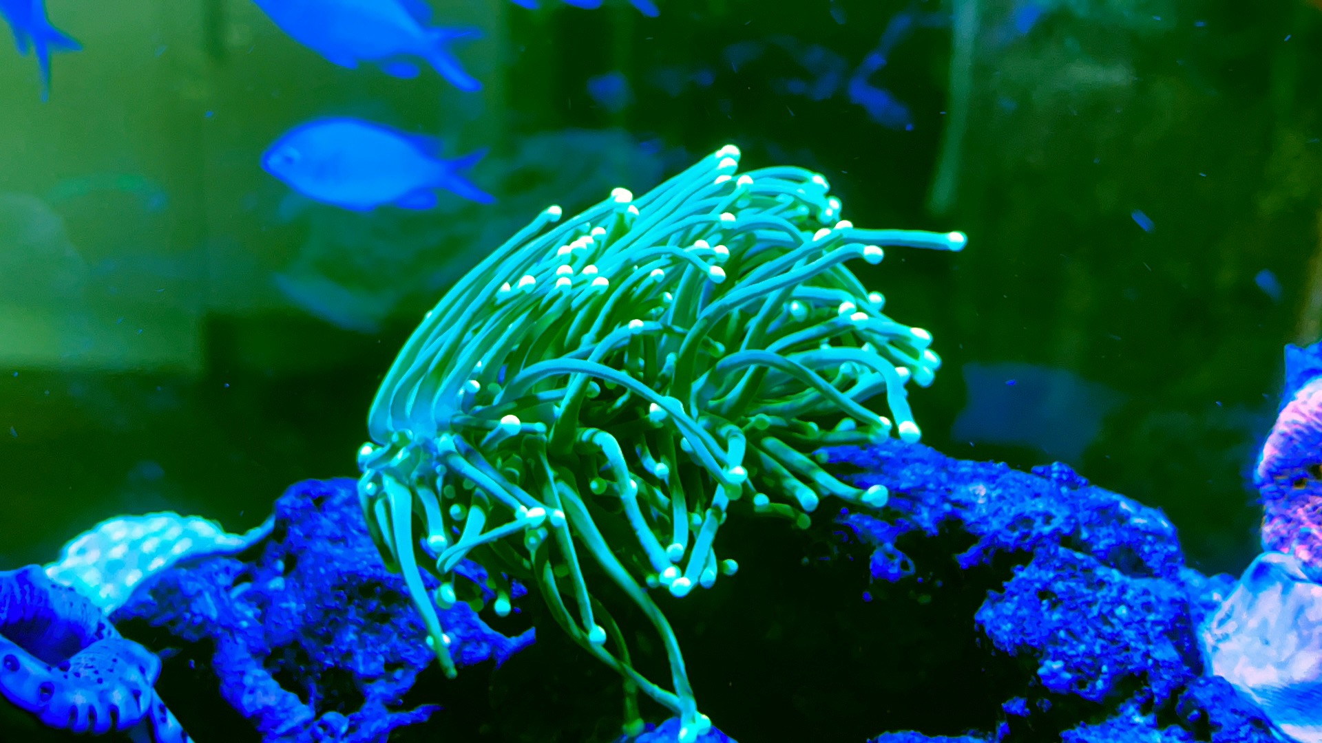 Den “pind” /Gogonia, jeg fik sat i en klump fragepoxy på hovedet, har det fint. Den er begyndt at vende “armene” og polypperne op af og har sat nye polypper i klipsåret, så den trives også. Jeg kæmper en lille smule med glasroser, dem “nuker” jeg med saltsyre og forsøger at suge stumperne op. Jeg vil rigtigt gerne have fat i et par wurdmani rejer, eller én af de der nøgengælle snegle der æder dem. Den hedder noget med B så vidt jeg husker…? Var der ikke en her på forum der havde yngel af dem???