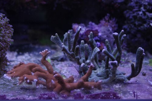 De montipora digitata jeg havde stående i fragmentakvariet kom over, så de også kunne nydes i akvariet. Siden de blev flyttet over, er de vokset som ukrudt! Det samme er mine bubbletip, der har delt sig på kryds og tværs og breder sig overalt. Det er en udfordring som man siger :scream: