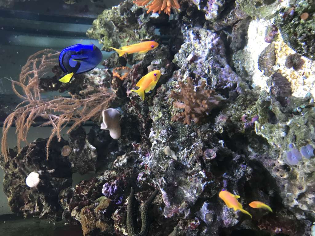 Så kom der en lille flok anthias i (nemanthias carberryi) fordi jeg var hos Carsten og de var på tilbud og jeg ville jo godt have lidt mere liv i toppen af akvariet og da min muræne har stået og kigge på mine klovne i lang tid tænkte jeg at jeg kunne sætte en flok nye fisk i og holde øje med murænen og tager den en af de nye så må den ud, jeg fodre den hver dag med musling blæksprutte eller rejer.