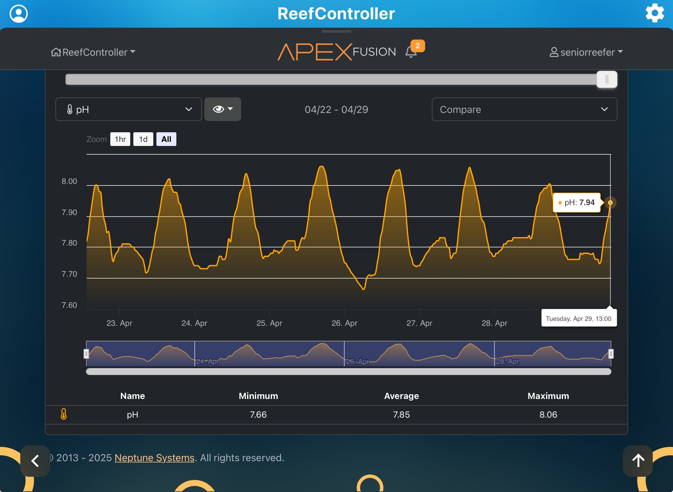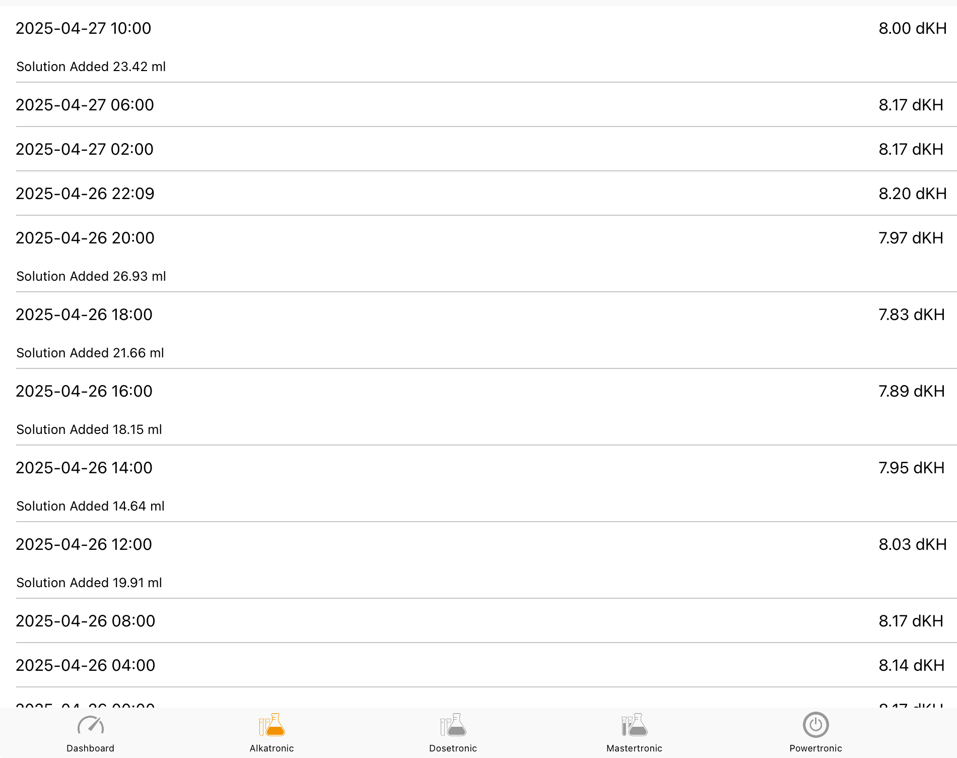 PT. har jeg hævet min calcium reaktor til dosering på 101l/dagligt. Alkatronic dosere omkring 15-25ml pr 2 timer interval, som jeg tester, ved værdier udenfor det valgte område.