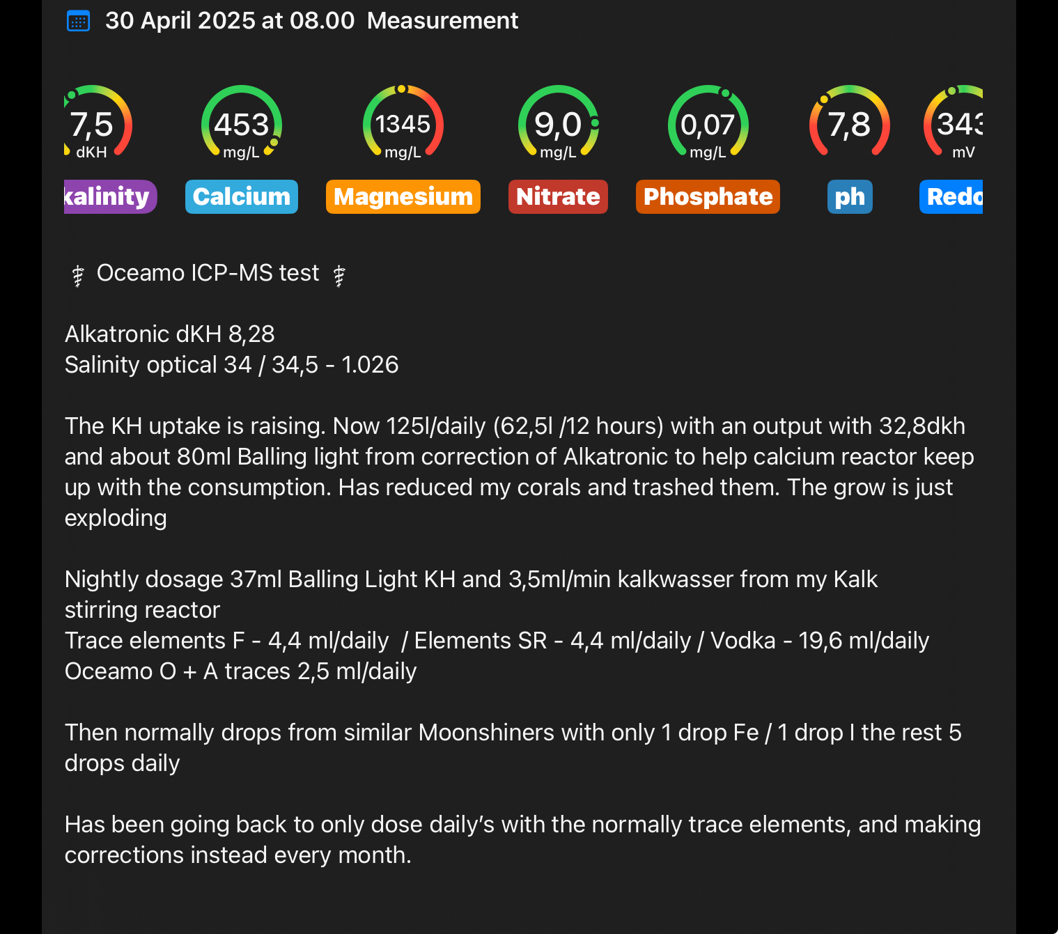 Den nattelige dosering er 3,5ml/min Kalkwasser og 30ml balling light. Dette har resulteret i en for lav calcium værdi, så doseres nu separat for at komme op på 420-440