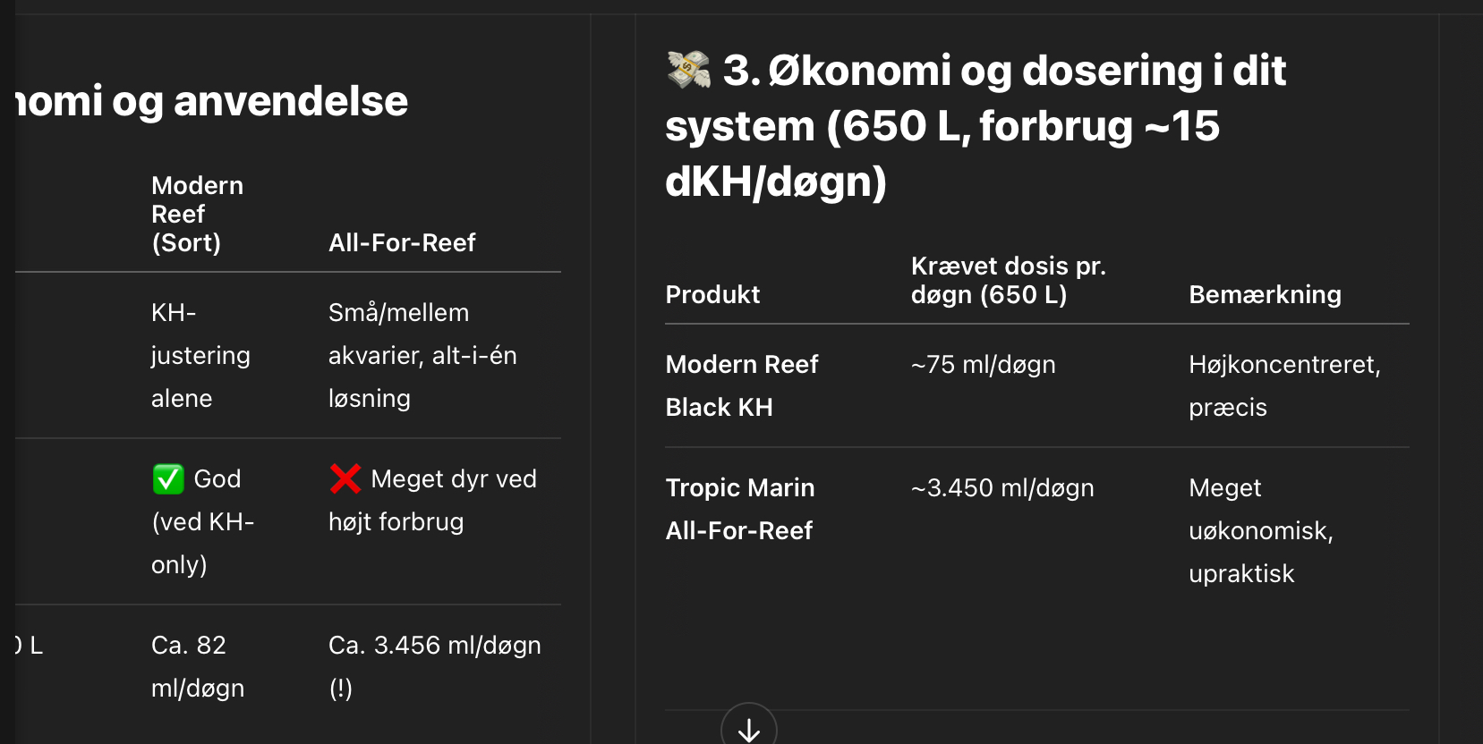 Og Modern Reef udregningen på 75 ml, er til 100 liter saltvand. Ganget op til dine 650 liter er det 500 ml om dagen for at hæve KH med 14.9RKS.png