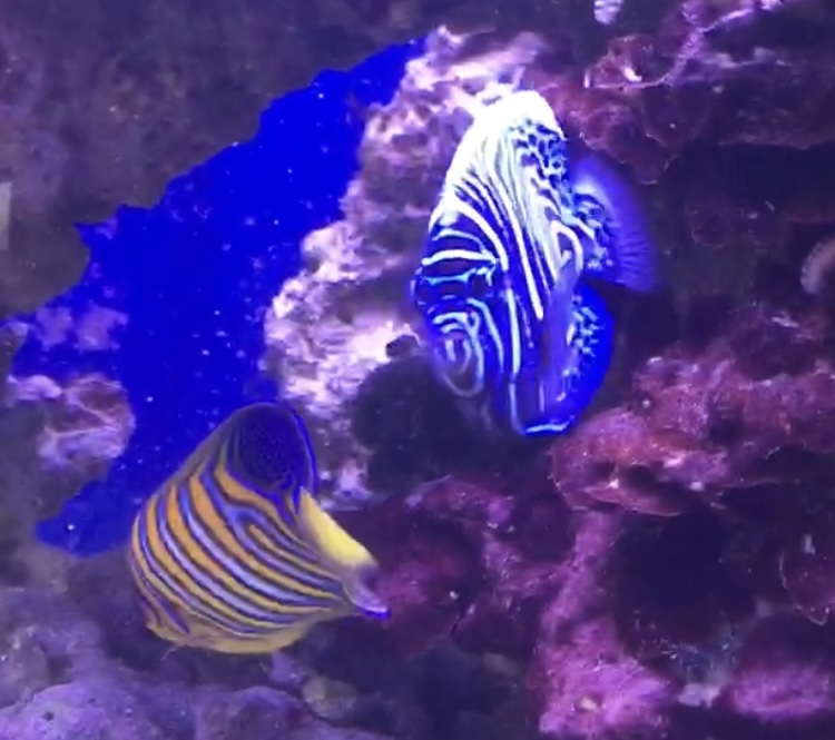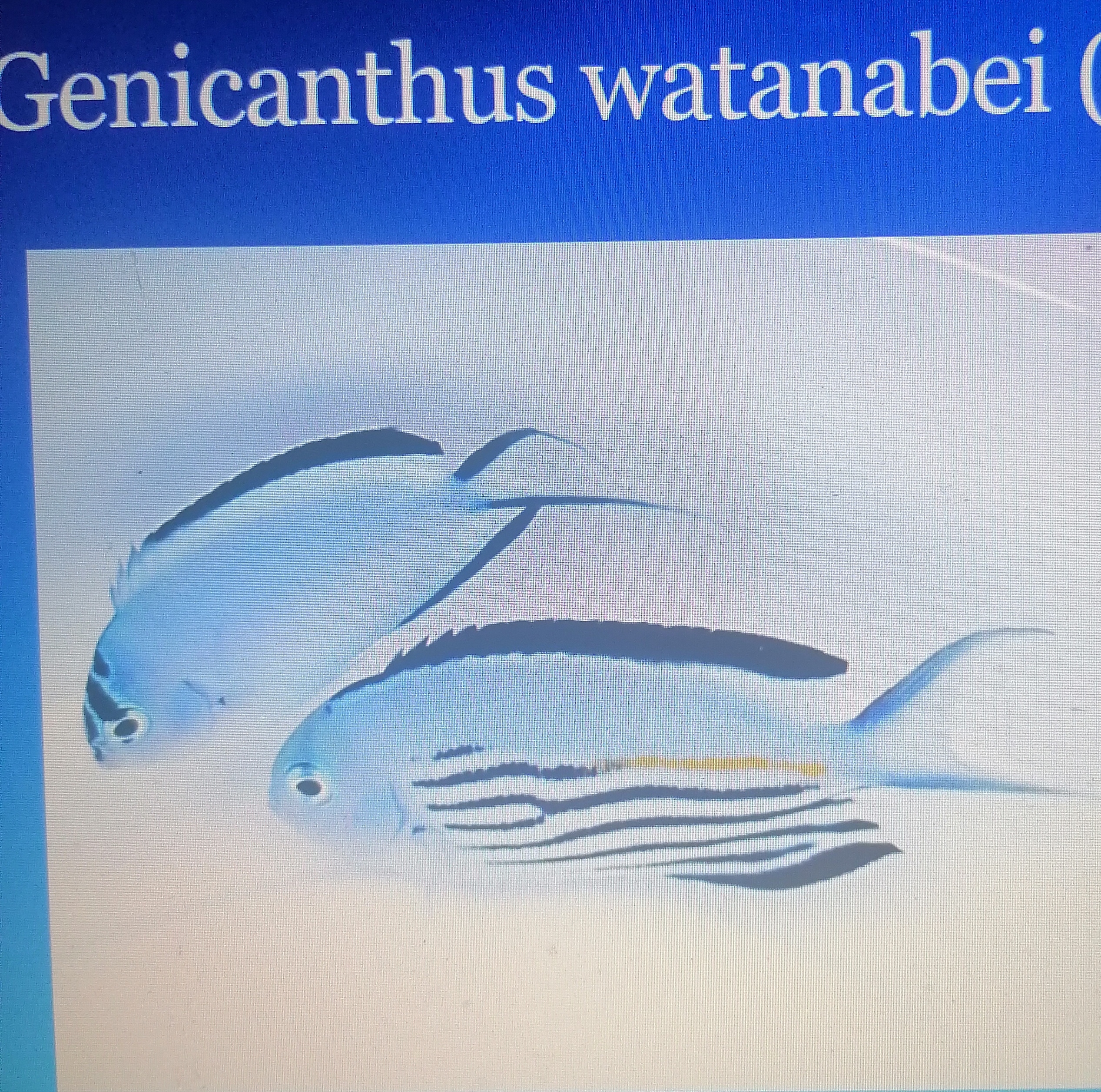 Vakler mellem en “fregnet” kirurg = Acanthurus Maculicpes, eller 2 stk Genichantus Bellus (én af svalehale kejserfiske arterne). Hanner af disse er sjældent i handel, men som ved mange af de andre fisk skifter den mest dominante fra hun til han på et tidspkt. Det kunne være super fedt med sådan et par.