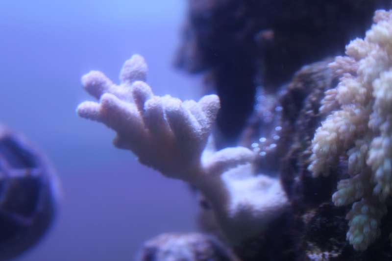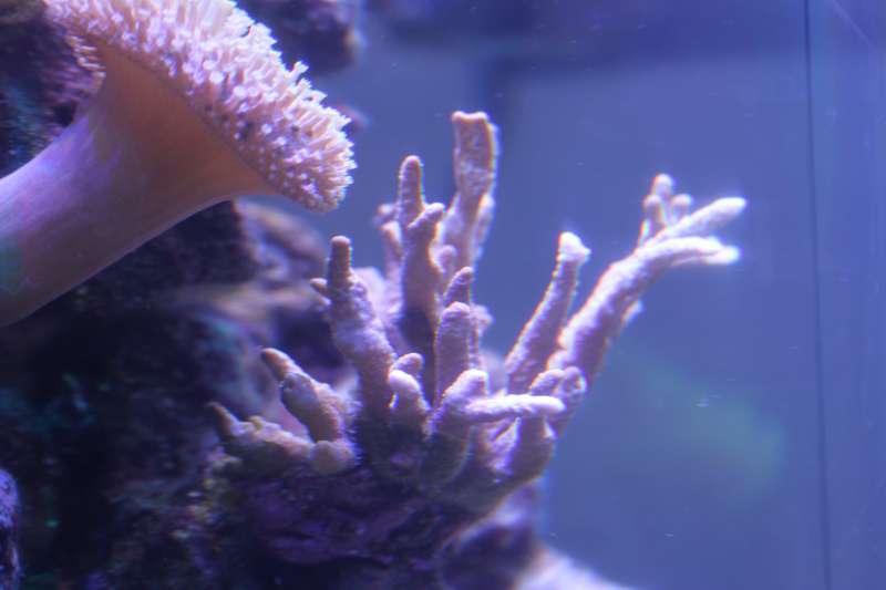 Jeg kom også til at købe en Hydnophora: Og endnu en jeg ikke kan navnet på: Mine Acanstrea'er har det godt: Det samme har mine minicarpetanemoner: Desværre betød de fejl jeg har begået, og som er nævnt tidligere i denne tråd, at flere af de koraller jeg havde døde, denne var umiddelbart en af dem, men der er sgu liv i spidserne, hvis man kigger nøje efter! Dette ses bedst i RB-lys, men er næsten umuligt at tage billeder af, så her er et i almindeligt lys: Så har jeg også denne, som undrer mig? Jeg kan ikke hitte ud af hvad den er heller... Og så er der en af de gamle, som faktisk har det ret godt: