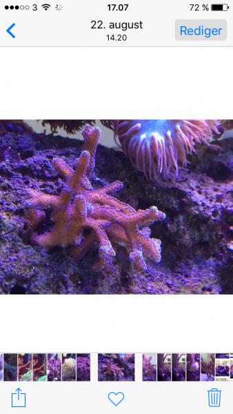 Jeg smed caulerpa taxifolia i den anden dag, under 15 watt gro lys (røde og en enkelt blå LED), og jeg må sige at jeg er meget imponeret over væksten. De går helt amok! Jeg vil umiddelbart skyde på at de har fordoblet deres rhizom på en uge, og både nye "blade" på rhisom og fra de gamle blade. Det er ikke fordi min næring er skyhøj. NO3 er faldet fra omkring 5 til 2.5 på den uge, og PO4 har jeg ikke målt. Min grønne staghorn acro er grønnere end nogensinde før, så det kan ikke være helt galt.