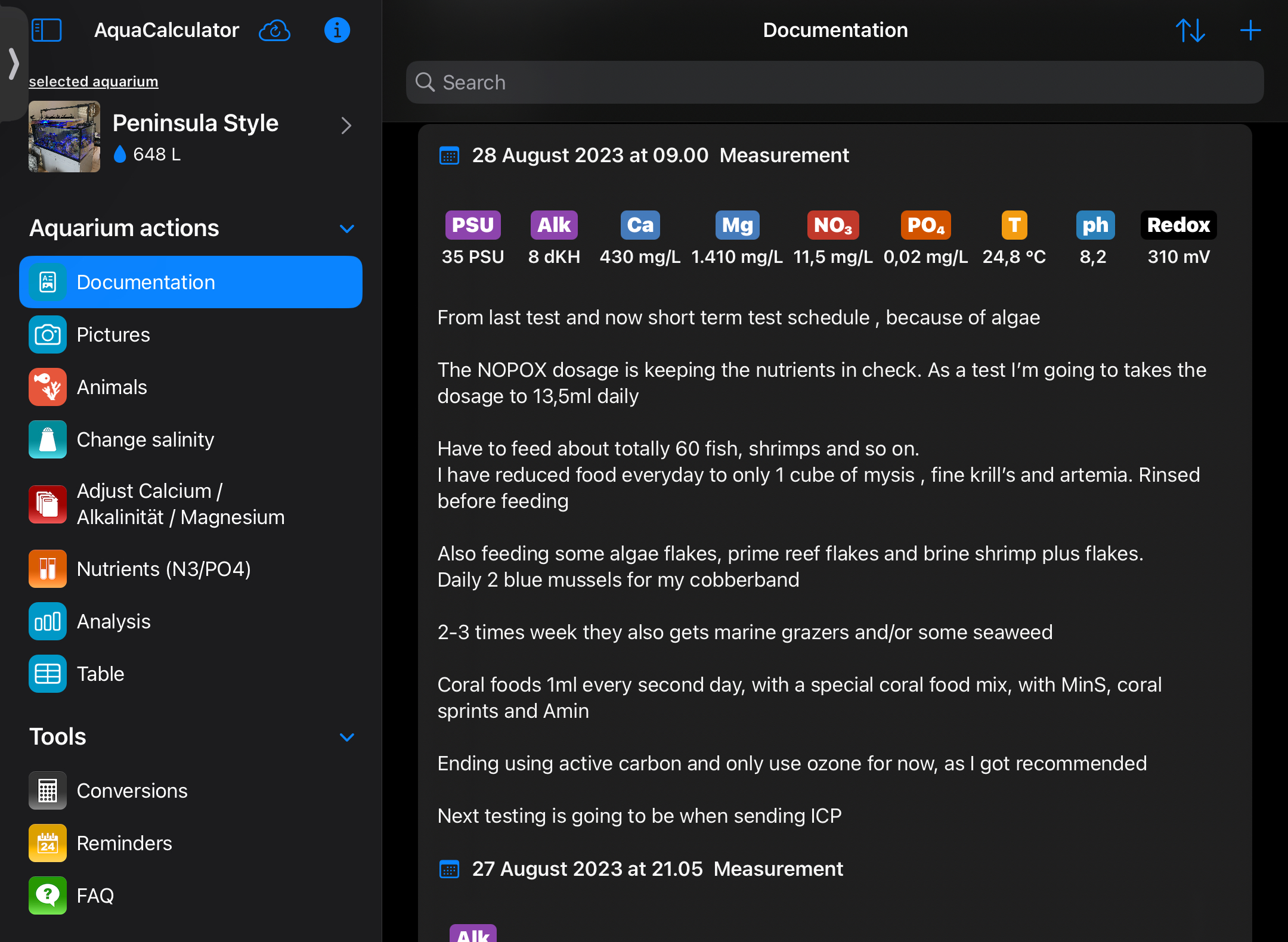 Som tidligere nævnt er kontrollen med KH blevet stabilt. Kan pt holde omkring 8 dKH i døgnet. Jeg besluttede at lukke for doseringen af kalk reaktoren om natten, og dosere nu Fauna Marin