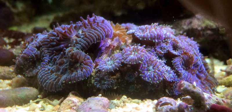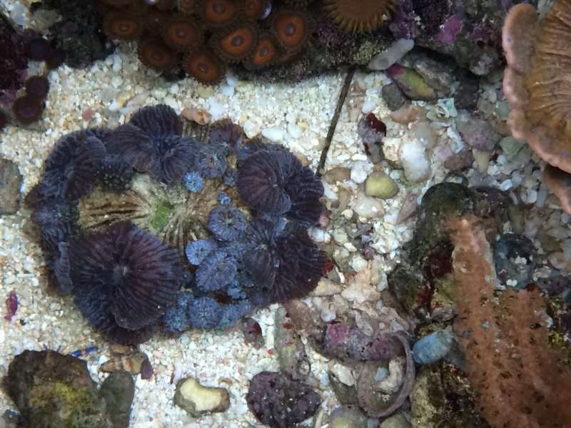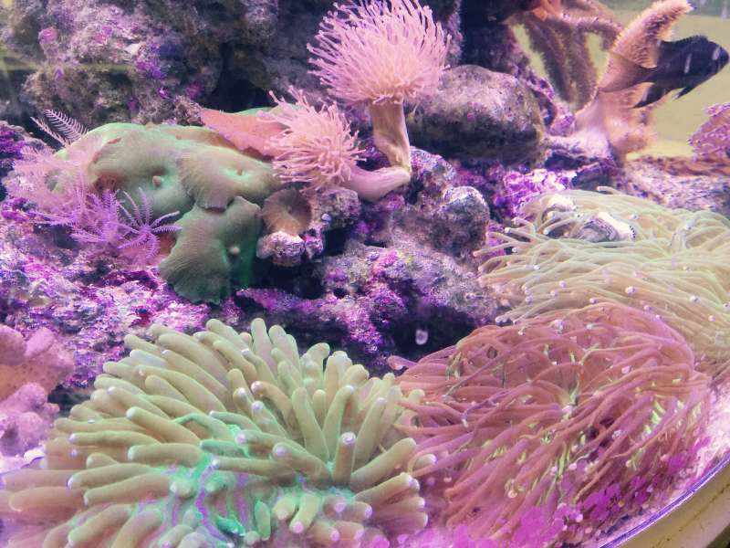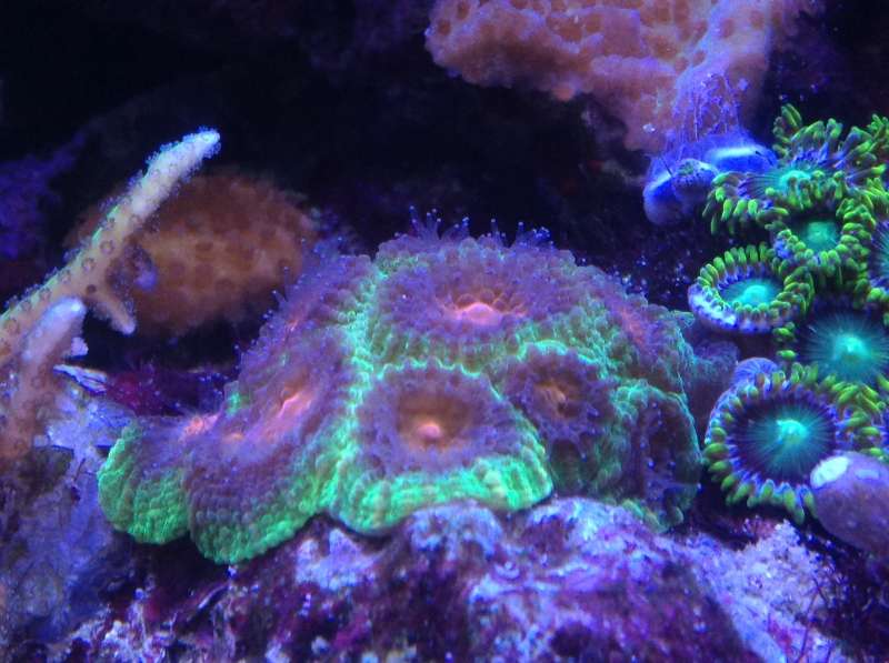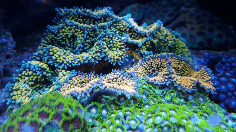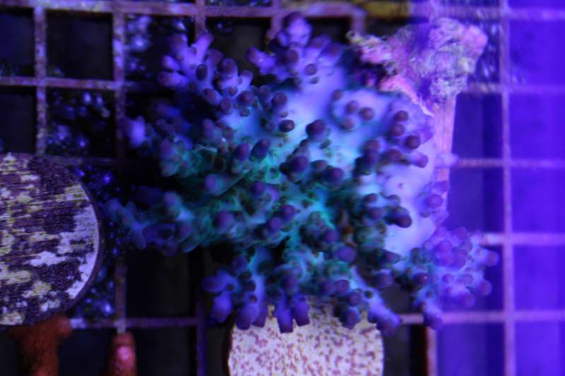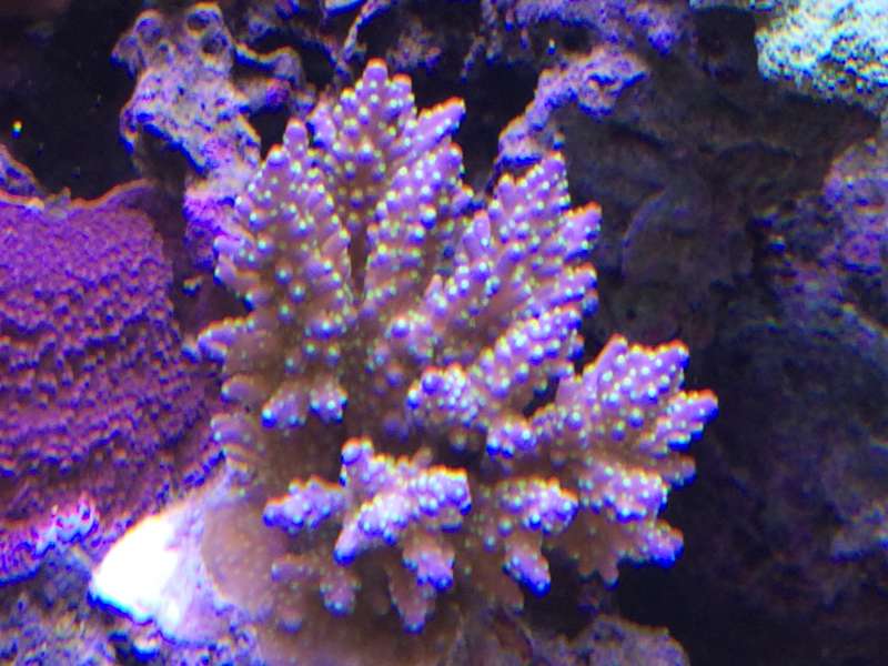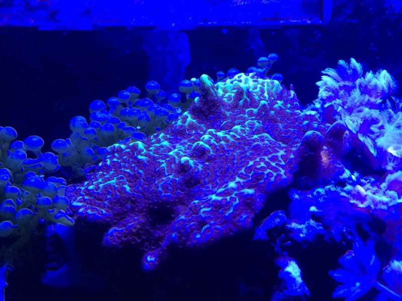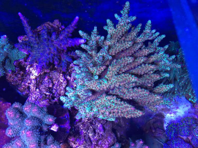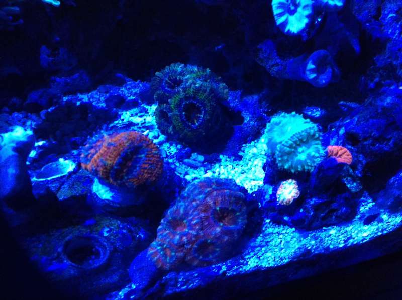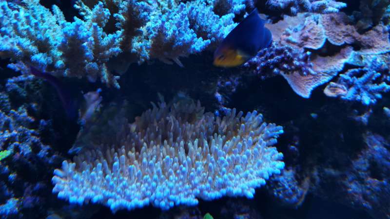 Blåt morgen foto at mine to plader på deres nye stensætning (den gamle væltede/stod og vippede) en montipora bla bla bla og en helt nyindkøbt plade acropora, og så lidt andre.