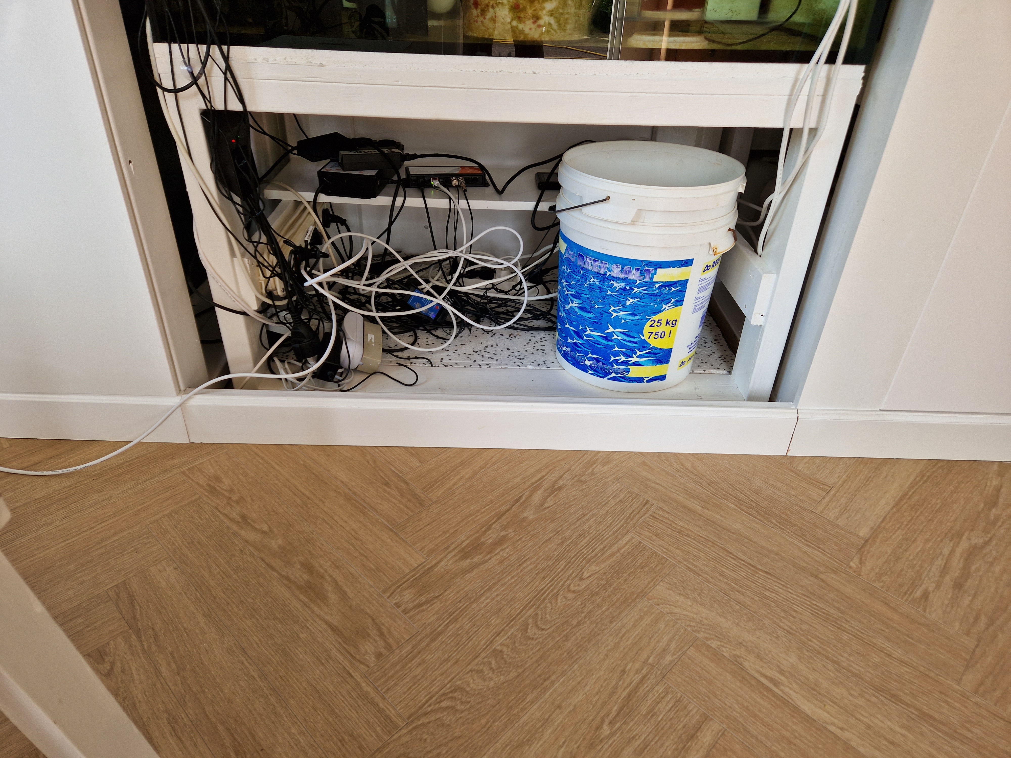 Pumpehuset var blevet utæt og kh var havnet på gulvet under akvariet.