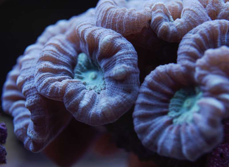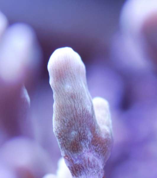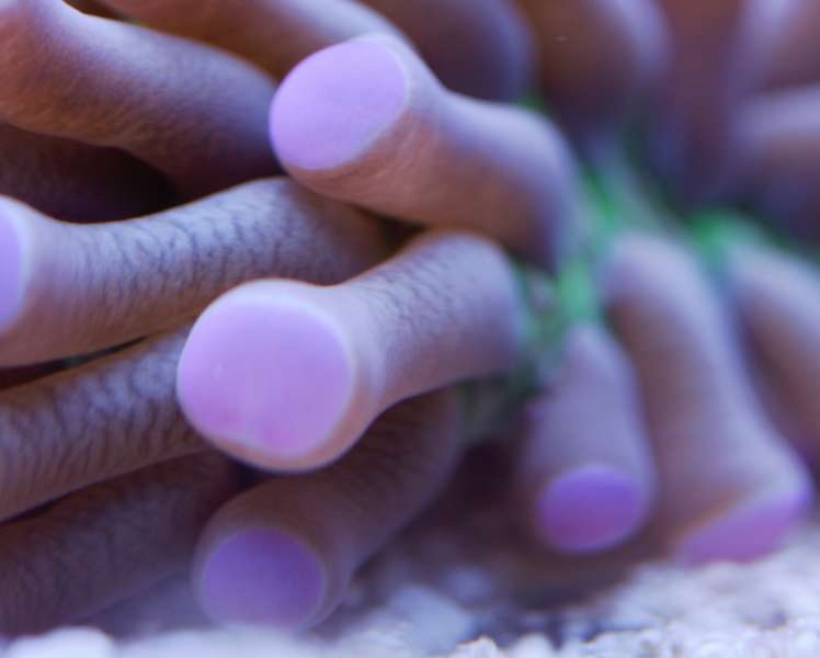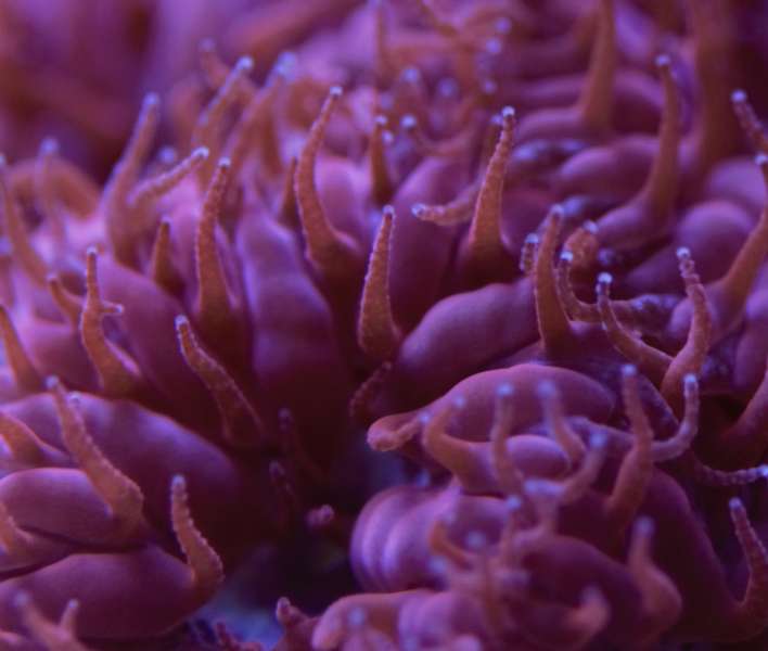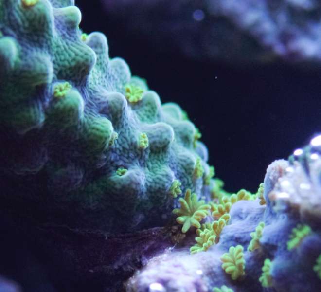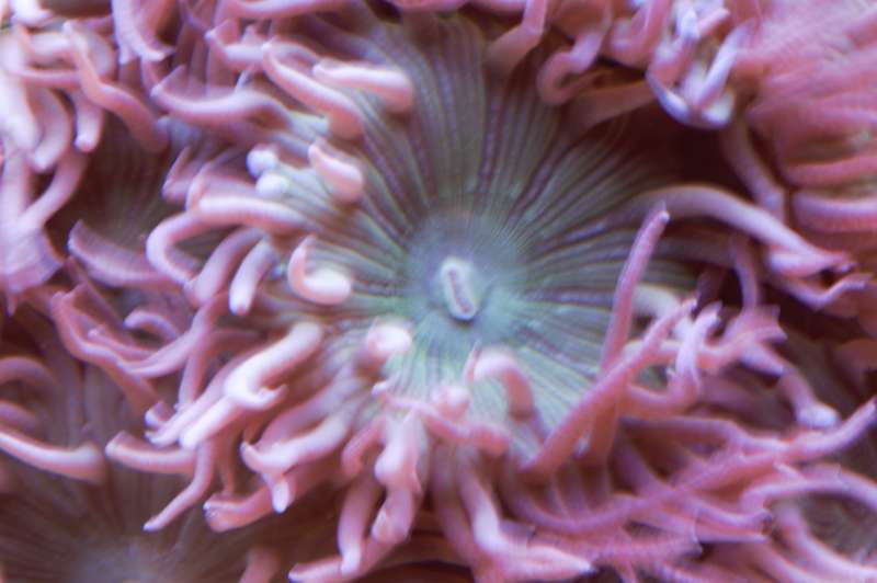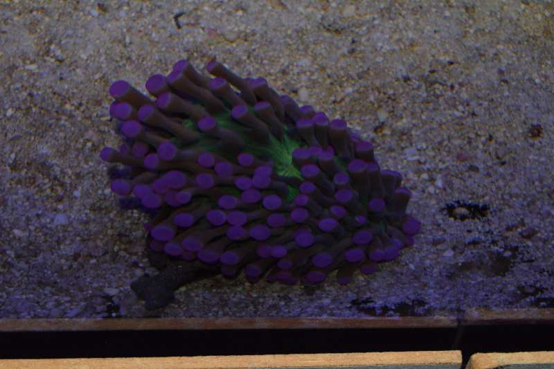 Den er faktisk vokset rigtigt godt her i huset. Den er dobbelt så stor som da jeg købte den for ca 2,5 måned siden. Sjov koral.... Den flytter sig lidt hen over bunden, om morgenen er den meget lille, men i løbet af dagen puster den både den grønne base og polypperne meget op. Flyttede den lidt forleden dag. Det pink i spidsen af polypperne smitter meget af og går nemt af dem, men kommer igen over et par døgn.