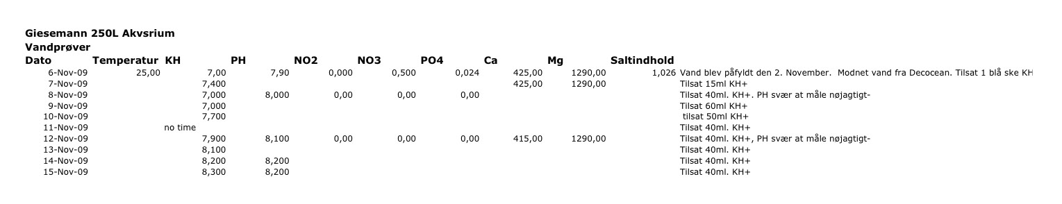 Dato Temperatur KH PH NO2 NO3 PO4 Ca Mg Saltindhold