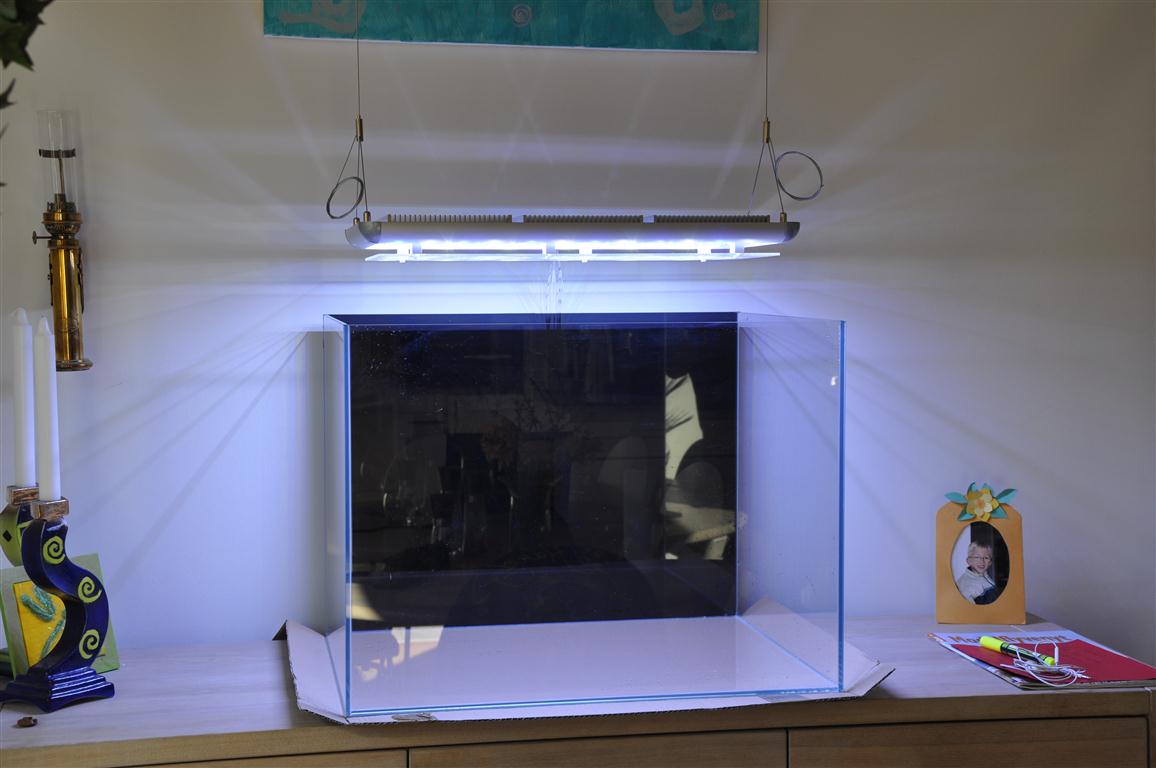 så kom lampen op at hænge, akvarium har fået sort foliebaggrund på nu mangler jeg bare vand,steen og mange penge. Lampen kører her på bilderne kun med 50% af dens lysstyrke og jeg regner med, at i indkøringsphasen skruer jeg den ned til 35-45%.