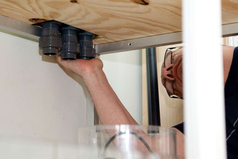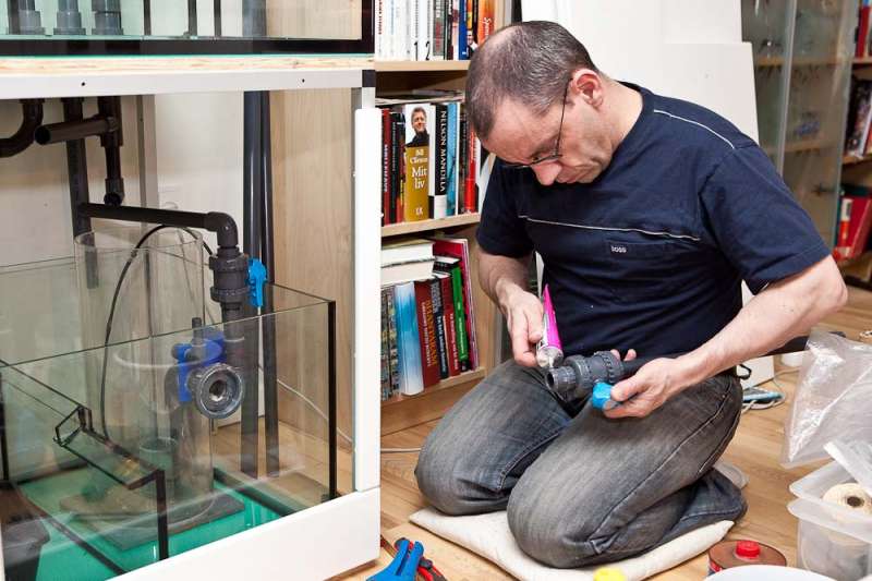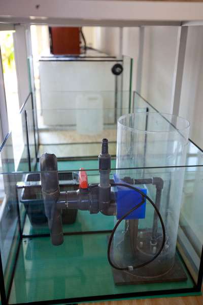 Der er ved siden af sumpen et ekstra kar på godt 80 liter. Normalt er det i forbindelse med resten af systemet via en pumpe.I bunden er der en tappehane der forbindes til en slange der i mit tilfælde føres ud i brusenichen når vandet skal udskiftes. Når dette sker slukkes pumpen der forbinder karet til systemet. Derefter fyldes karet med osmosevand og der fyldes salt i. Derefter sørger en anden pumpe for at blande saltet ordentligt i osmosevandet. Når der er gjort slukkes blandepumpen og pumpen til systemet startes igen. Så et karet igen en del af sumpen og det nyblandede vand bliver stille og roligt blandet med resten af vandet.