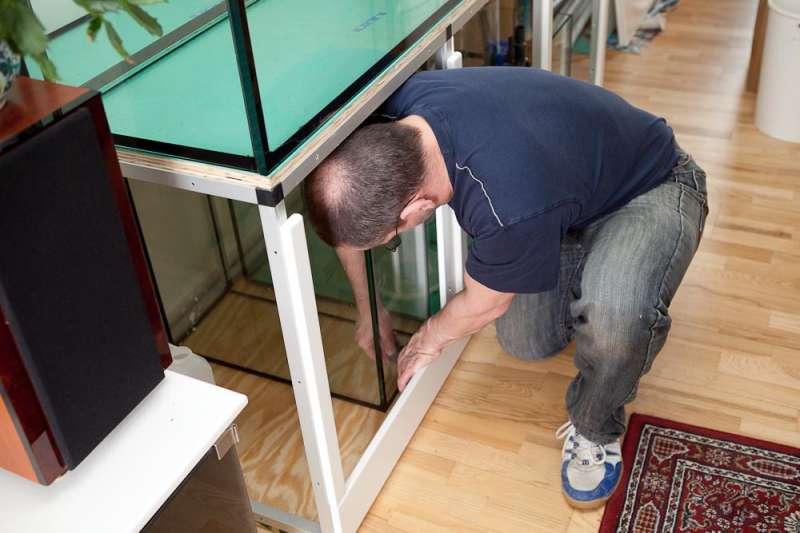 Der er beton under parketten og den nye balje står samme sted som den gamle og gulvet har ikke givet sig. I det nye står hele skabet og akvariet og fordeler vægten på den vandfaste krydsfinerplade. Derfor er der jo stadig en mulighed for at gulvet vil give sig.