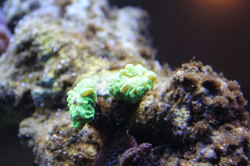 Caulastrea curvata (Neongrøn) med et lille stk Montipora Reverse Porkerstar på.