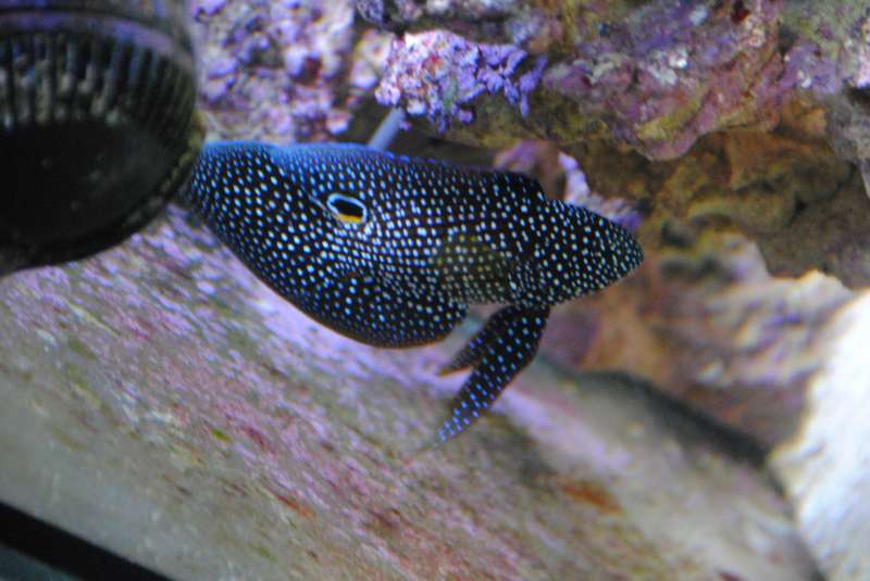 Den er ikke særlig sky, Svømmer frit rundt i akvariet. Går jeg helt hen til det, svømmer den ind mellem stenene, men kommer ud igen efter et par minutter