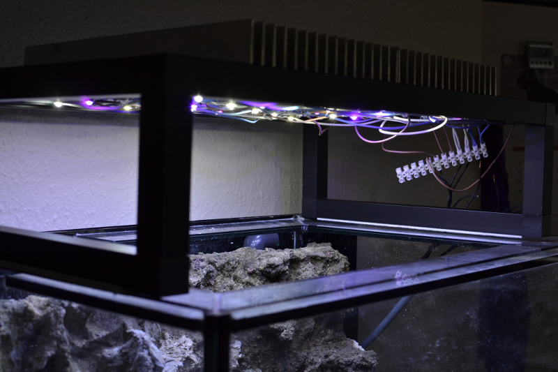 Mht. Farve sammensætning så sigter jeg efter så bredt et lysspektre som muligt. Det betyder at jeg har fra ca. 400nm (UV) 660nm (rød). Mener at have læst at både UV og rød kombineret med de normale hvide og blå, skulle være fordelagtige i forhold til fotosyntetiske koraller.