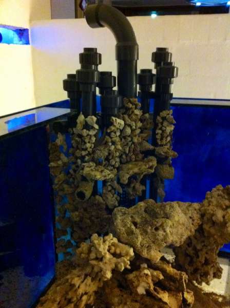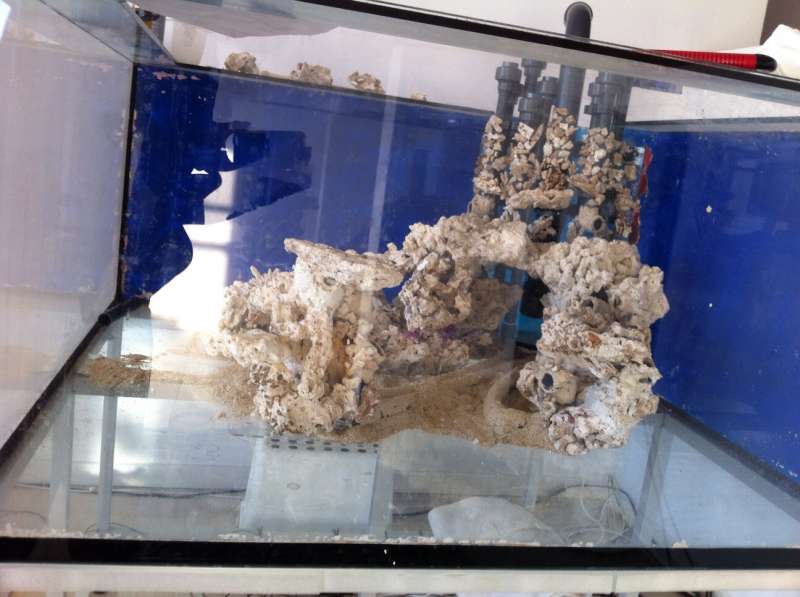 Polypstenen set fra den ene side af akvariet. Udmundingerne er skjult bag stenene der stikker op, men dette skulle gerne blive knap så nemt at se når stenen bliver groet til med skiver og polypper.