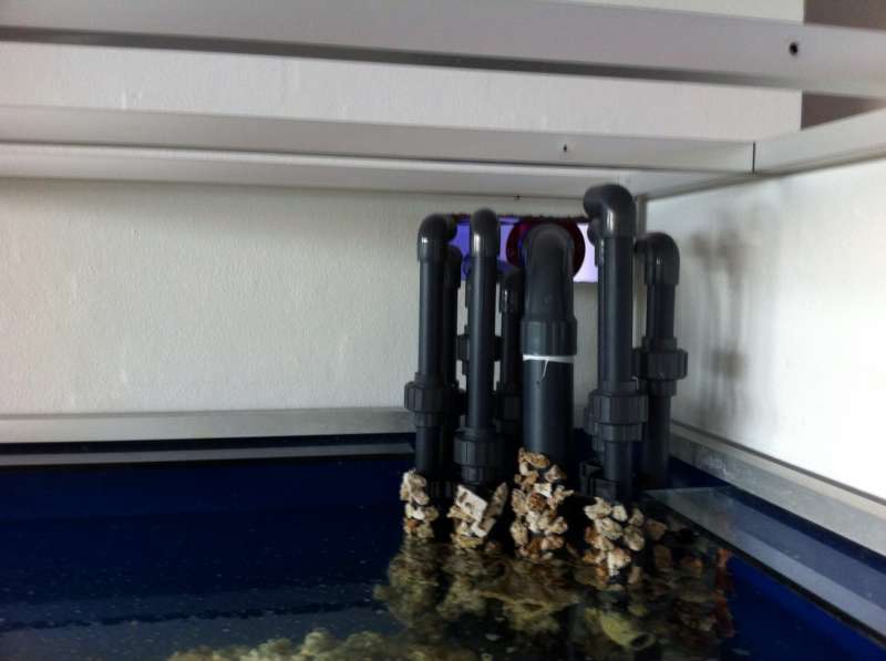 Planen er at display tanken får lov at stå med saltvand, lidt levende sten til at pode og bakterier. Når ammonium og nitrit er i nul kobler vi den nye sump på, og fiskene og koraller kommer over i display tanken i denne forbindelse.