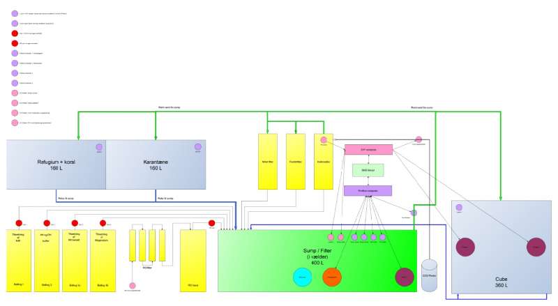 Så kører Cuben med saltvand i. Dog stadigvæk "stand alone". Den er ikke koblet på mit øvrige setup endnu. Næste weekend regner jeg med at skifte 80 L vand og justere salt + temp ind, så det matcher mit øvrige setup 100%. Så kobler jeg den på. Dejlig nemt. Bare åbne 2 haner, så kører den over sumpen som de øvrige. Så stiger min samlede volume til omkring 1000 L og giver ekstra stabilitet. Jeg ligger på pænt over 400 i redox og lader den værdi styre hvor hurtigt jeg kobler Cuben helt på. Stille og roligt indtil hanen er fuldt åben. Falder den til under 350 så lukker jeg for Cuben indtil den er oppe igen. Så får filtre og skummer en chance for at følge med den øgede belastning fra Cuben. Glæder mig til jeg kan flytte fisk og koraller over men der går lidt endnu (læs nogle uger).