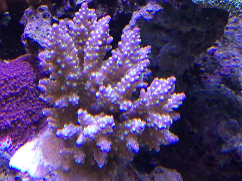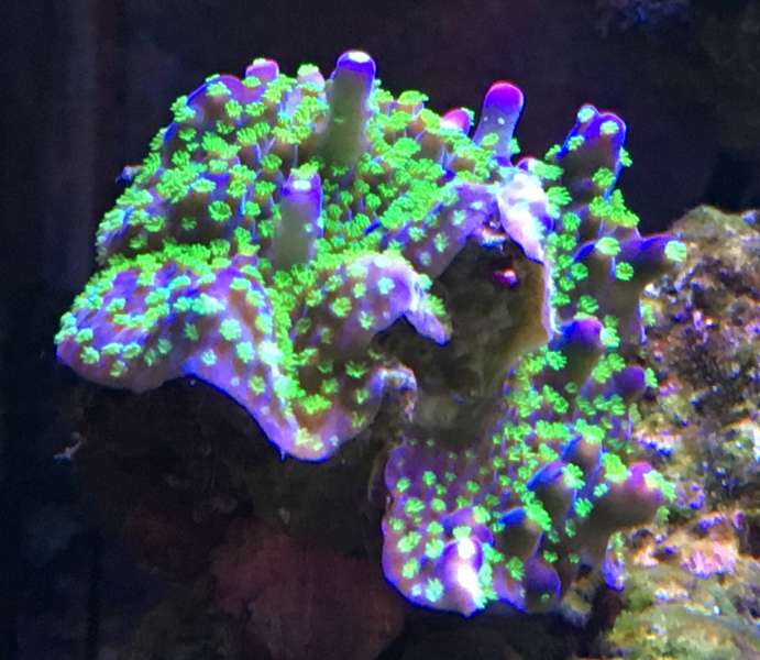 Alle de sider jeg har set med Acropora Nana siger den har creme farvet polypper. Dem på min er skrig grønne og selve korallen er brun/rødlig med mørk lille spidser.