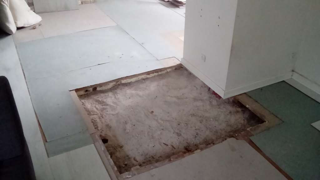 Nu er det beskadiget gulv fjernet og tømrerne kommer imorgen for at genanligge gulvet....
