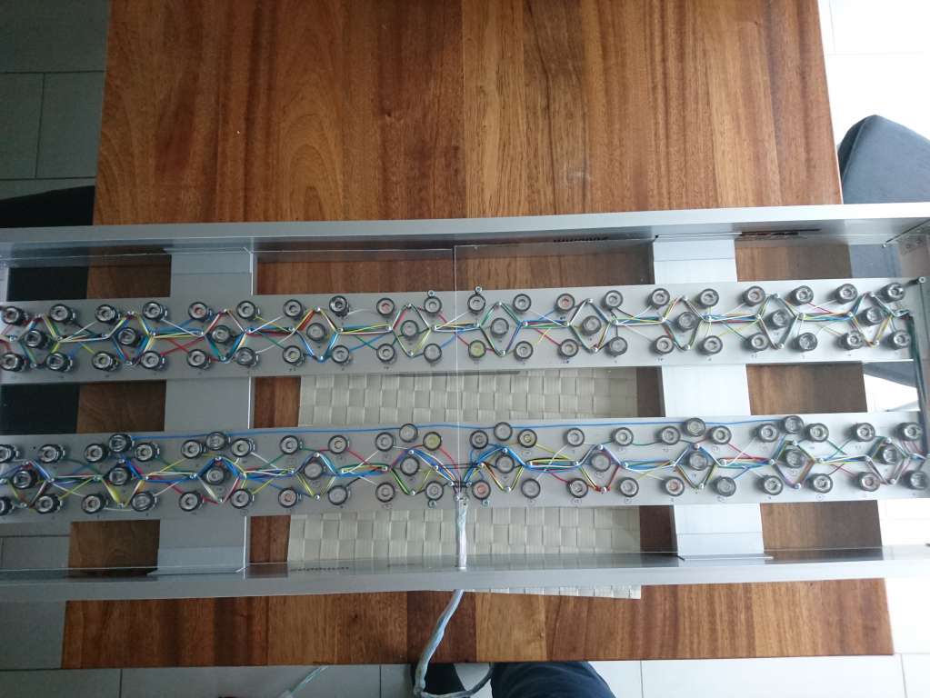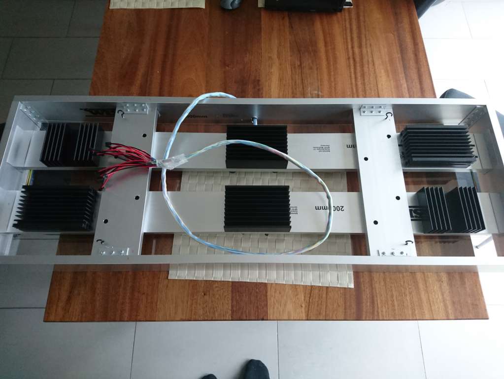 Set ovenfra ser armaturet således ud med de ekstra køleplader. Her ses armaturet nedefra. Har fået monteret linser og acrylplace. Linserne er en blanding af 60, 90 og 120 grader. For de blå og hvide LED er der flest 60 graders linser, da der er mange af dem, for de mere "exotiske" farver som grøn, gul og rød er der brugt 120 grader for at sprede lyset lidt mere. Og så er der hele kontrol delen med arduino og drivere. Havde egentlig regnet med at have det hele i én og samme kasse, men måtte desværre flytte driverne ud på en alu-skinne, da det blev for varmt i en lukket kasse med alle 318W kørende. De mange drivere er for at kunne styre de forskellige grupper seperat, så jeg nemt kan styre hvor meget lys der skal være. Arduinoen er konfigureret således at den har 10 output ben som styrer hver en relæ. Dette kan så tænde for en hel gruppe af LED via driverne. Desværre kan jeg ikke "Dimme" da dette ville blive en langt dyrere løsning. Derimod har jeg lavet nogle ret små grupper helt ned på 6 LEDs så jeg kan lave eret svagt lys. Endelig har jeg lavet en lyskasse af et gammelt porsa understel. Her har jeg monteret 4 stk 12cm blæsere til at køle lidt ekstra, hvis det bliver nødvendigt. Jeg har valgt store blæsere for at kunne køre dem ved lav hastighed og derved få dem helt lydløse. Blæserne kan naturligvis styres fra arduinoen. Så mangler jeg bare at tage et billede af hele herligheden monteret på mit akvarie..... Det må jeg gøre i aften, når der er stille i huset. I må pænt vente så længe