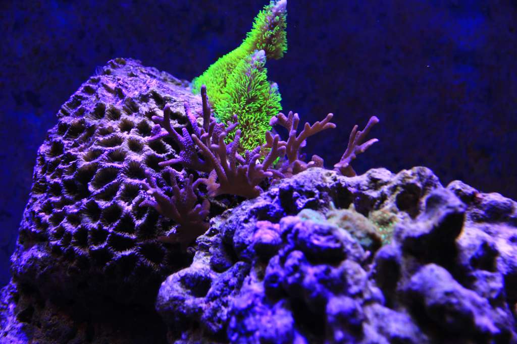 I dag ser akvariet således ud: Og her billeder af lidt udvalgte koraller: Planen er at jeg hen over vinteren vil finde lidt flere SPS'er til toppen af akvariet og nogle zoa'er til venstre side. Så hvis nogen af jeg fantastiske saltvandsfolk har nogle frags i vil af med hører jeg gerne fra jer.