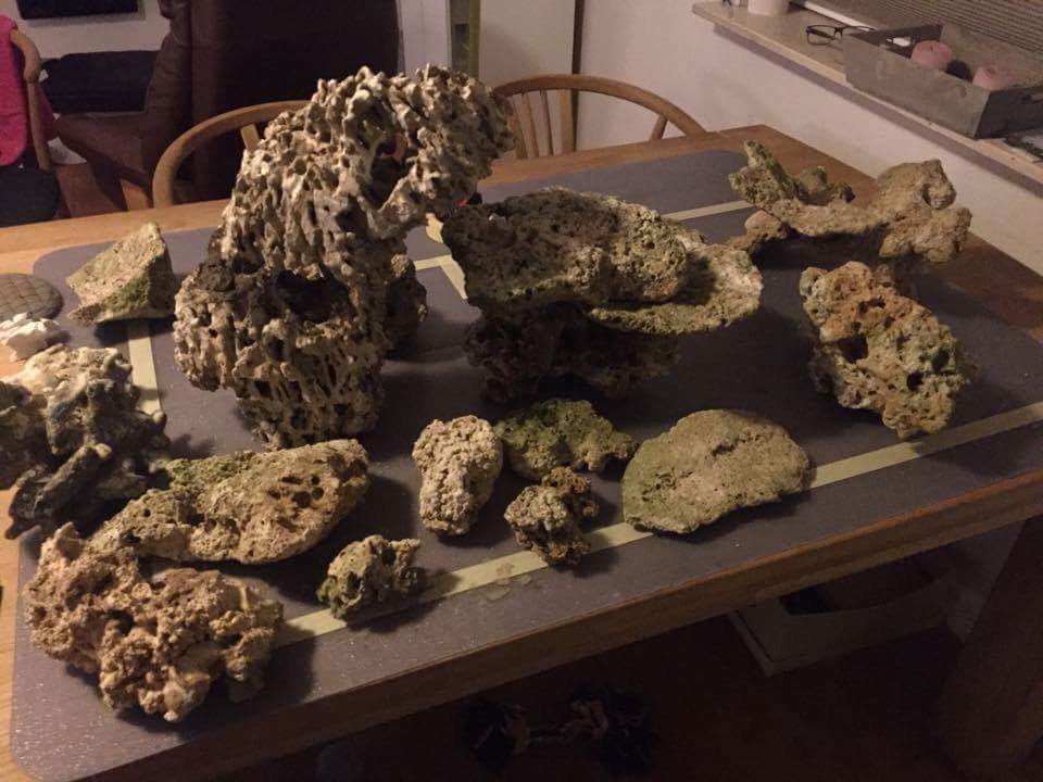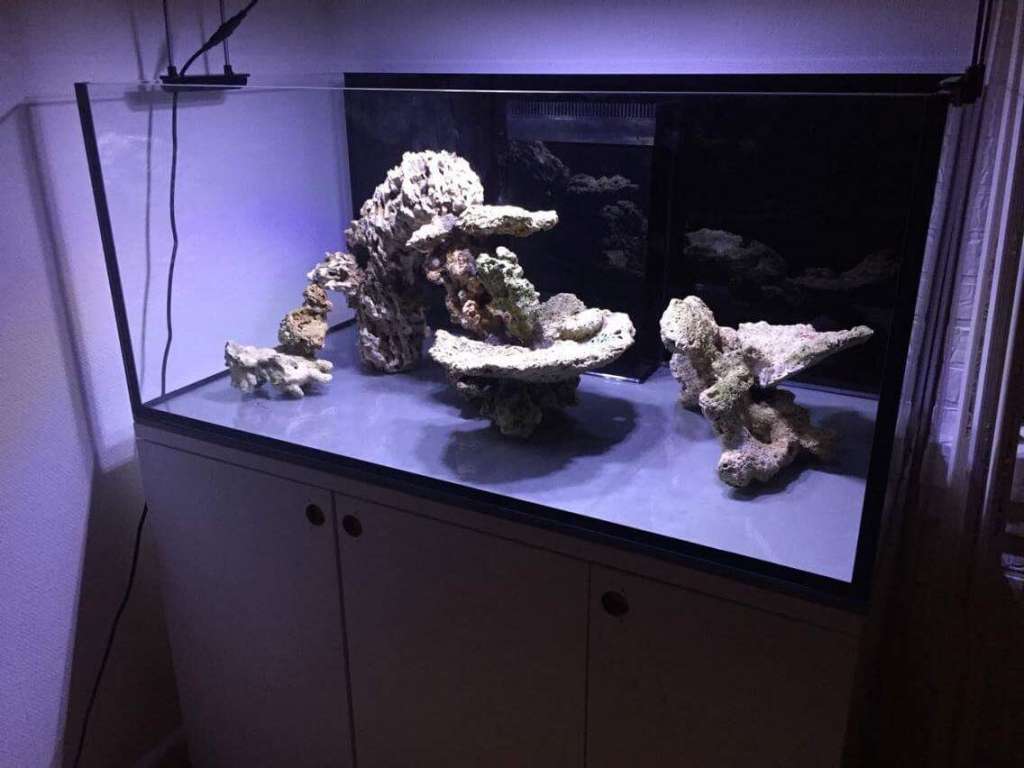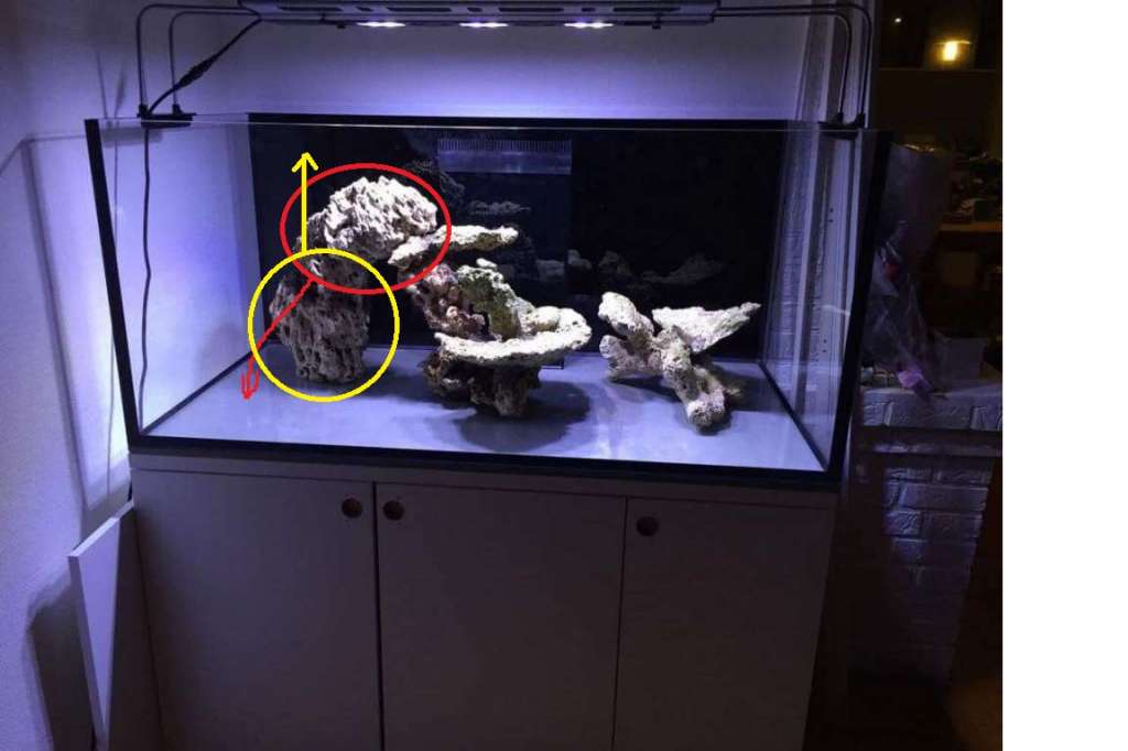 Mit forslag går ud på at tage stenen der er markeret med rød og flytte den frem i akvariet og stille den på bunden, den har en god form hvor der kan stå koraller.