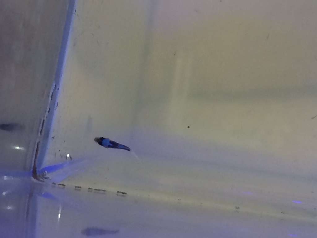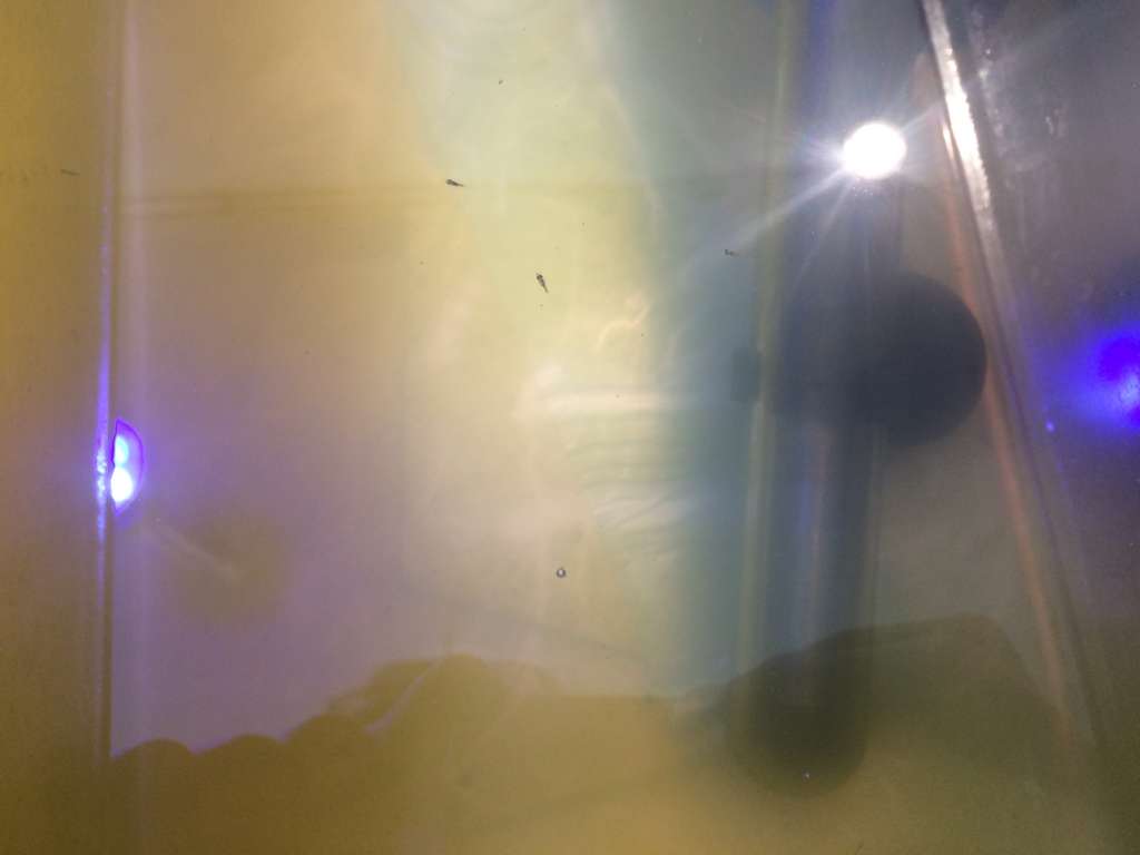 Ungerne fra første kuld lever fortsat. Jeg vil tro at der er 10 tilbage. Det tal har været stabilt i flere dage nu, så jeg begynder at tro på det. Jeg har i dag givet dem en smule pulveriseret flagefoder sammen med nyklækkede artemia og rotifers.
