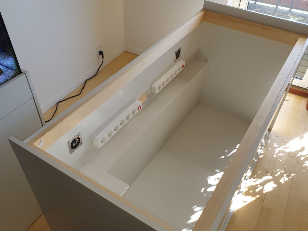 Jeg har monteret 2 stks ATI blæsere (fra en Powermodule t5 lampe) i bagvæggen, til at suge luft ud af skabet- der bliver 5 cm mellem skab og væg, så der er plads til at komme af med luften.