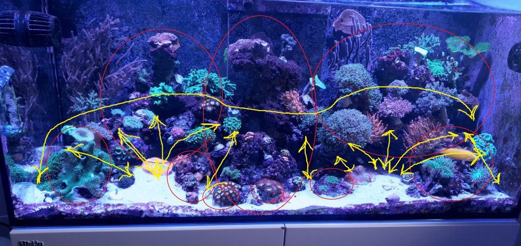 Hvis du sørger for at den nye pumpe er lidt kraftig, så vil den hive vand fra fronten med sig ind igennem de små gule kanaler, og det vand er friskt turbulent iltrigt vand lavet af dine MP-pumper og returpumpen. Så undgår du nok dead spots imellem stenene.