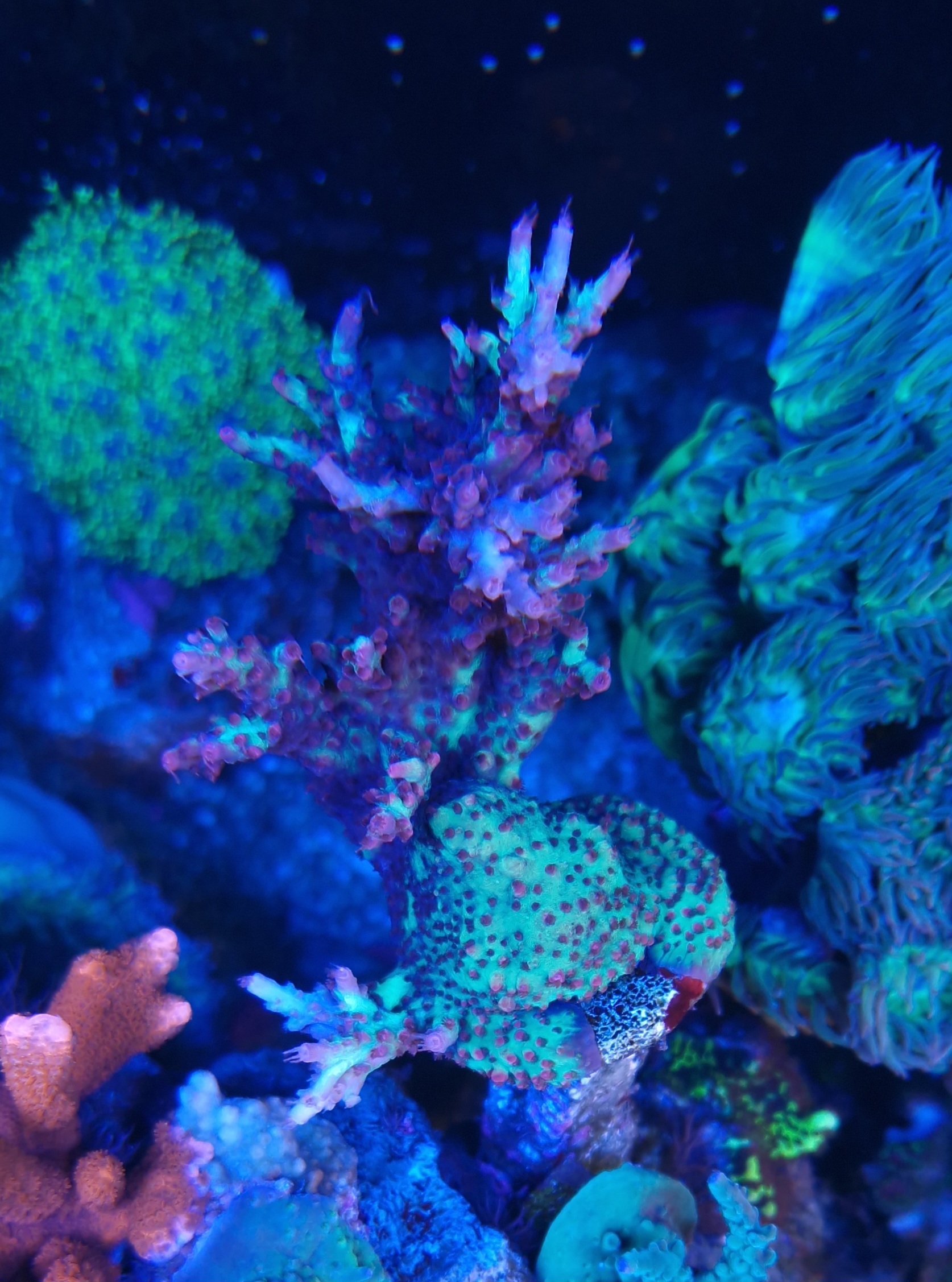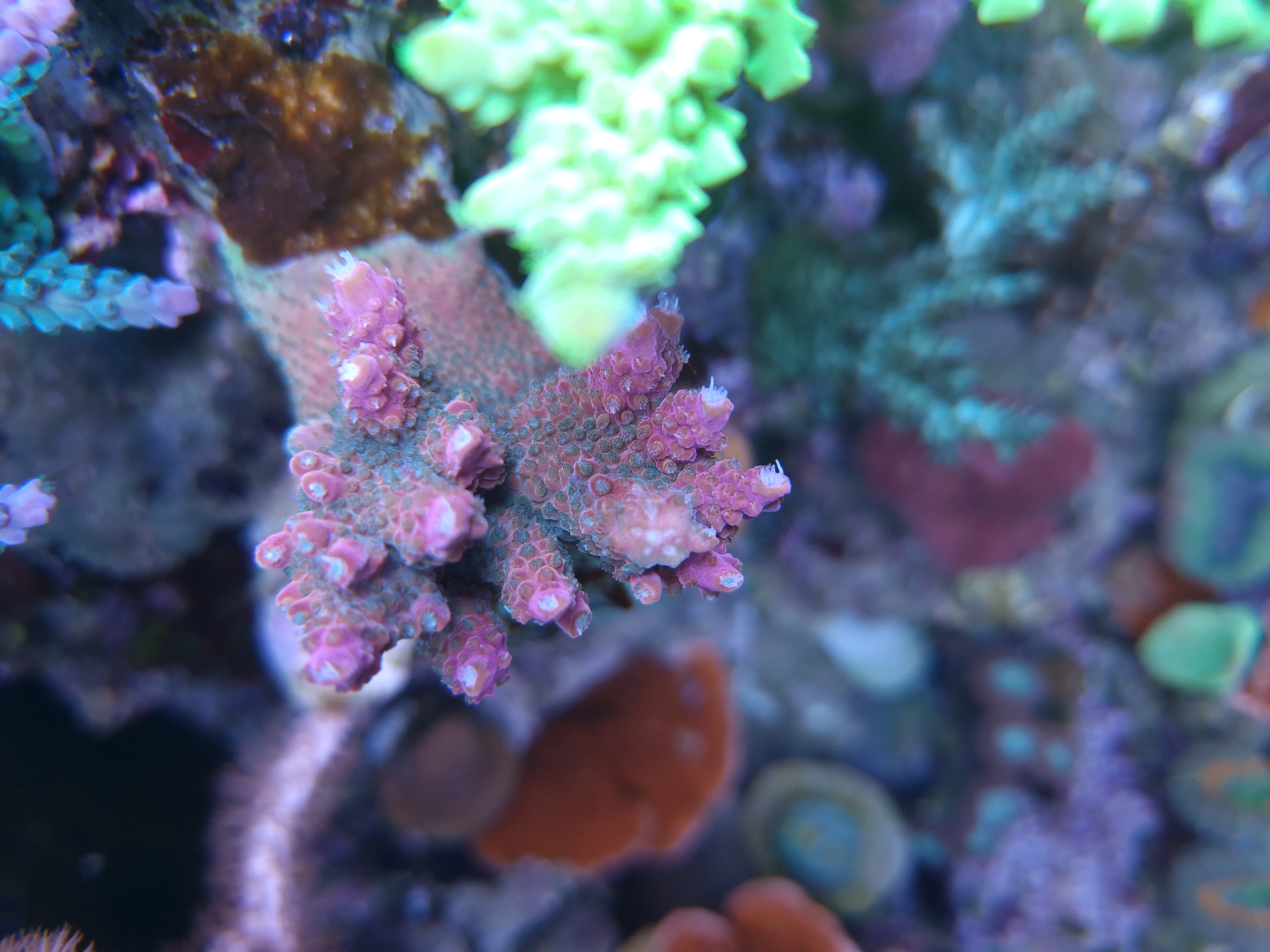ahh okay. Det er en pink staghorn. Den har ændret sig totalt fra det jeg købte. Det er den der er bagerst til højre i dette billede. Arten ved jeg ikke hvad er, men den har brugt et halvt års tid på at grundfæste sig og tykne, og nu skyder den grene i den der fede pinke farve. Men jeg ville nu gerne have beholdt den originale farve. :smart: