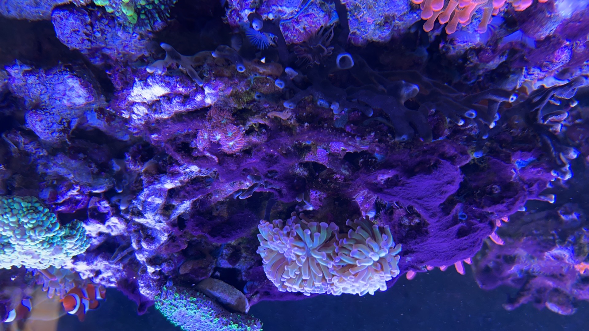Nå men koralrevet. Jeg måtte igennem endnu en nedtur, som alene skyldes min manglende evne til at lade være med at pille. I et forsøg på at få styr på næring og få korallerne til at gro, legede jeg lidt med lyset. Det skulle jeg aldrig have gjort. Der kom nu ekstra meget gang i hår alger. Så meget at jeg mistede mange fine koraller. Det lykkedes mig at redde en del ved at klippe det døde fra. Jeg endte med at stoppe al dosering. Var oppe på over de anbefalede mængder i AF B og C samt EasyReef phyto og zoo. Så det blev en slags nulstilling.