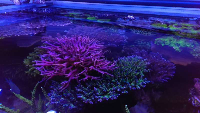 Hermed en lille hilsen i disse travle dage, snuppede et par aftenbilleder, da det er lææænge siden jeg har opdateret tråden. Alt er velkørende og korallerne er ved at vokse ud af baljen, har netop idag klippet min store grønne/blå acropoa voldsomt tilbage, da den skyggede en del for min store lilla Acropoa nana nedenunder, som i øvrig blev studset tilbage i april. Det er anden gang jeg må klippe den så meget tilbage, jeg har vel taget 12 cm hele vejen rundt i tableformen.